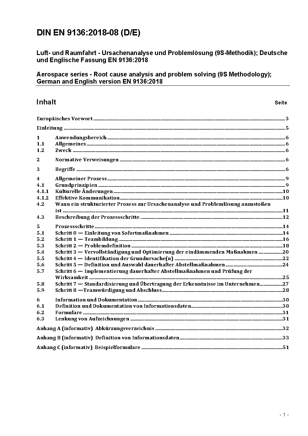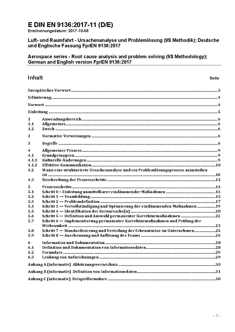 Luft- und Raumfahrt - Ursachenanalyse und Problemlösung (9S Methodik); Deutsche und Englische Fassung FprEN 9136:2017