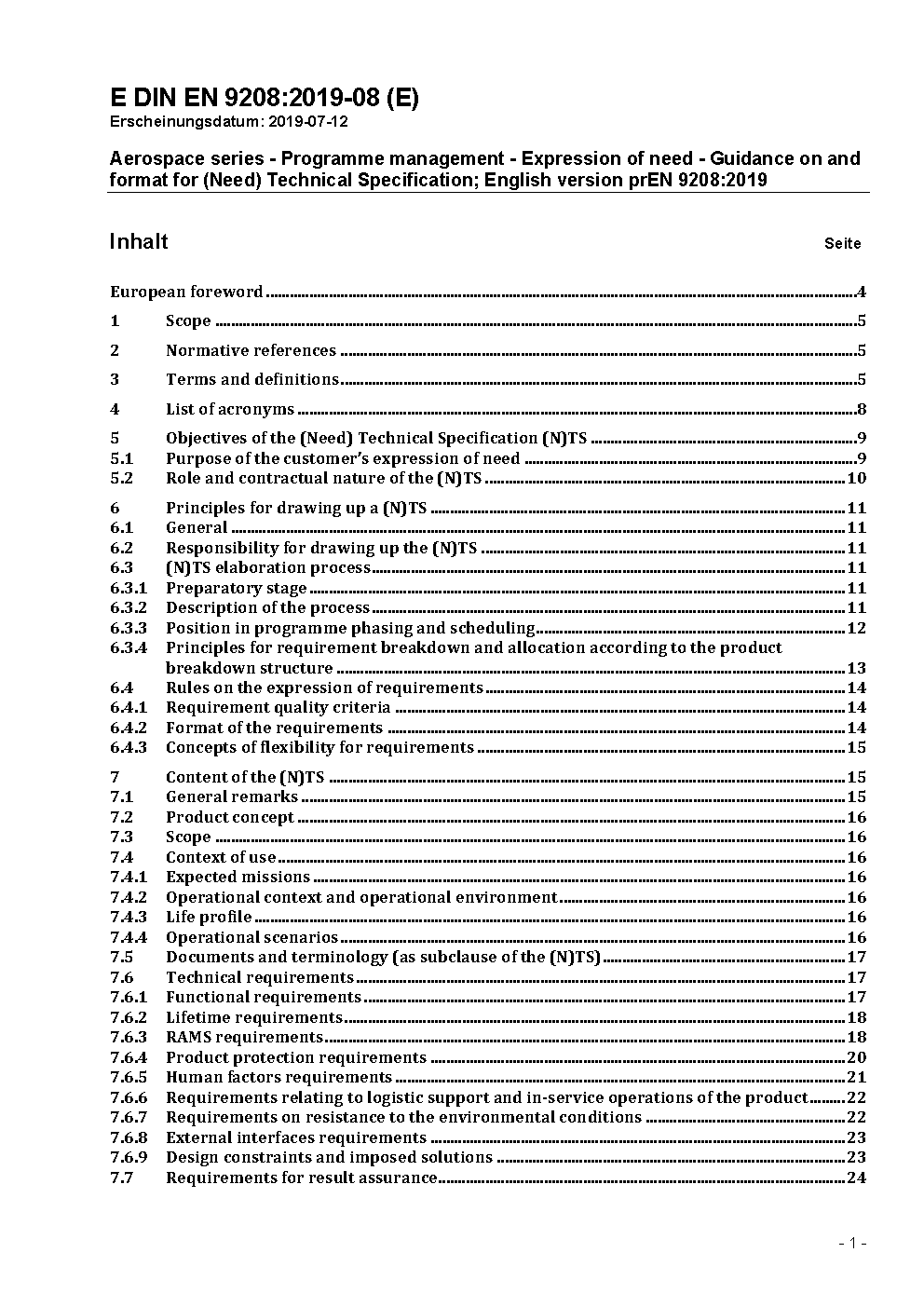 Aerospace series - Programme management - Expression of need - Guidance on and format for (Need) Technical Specification; German and English version EN 9208:2021