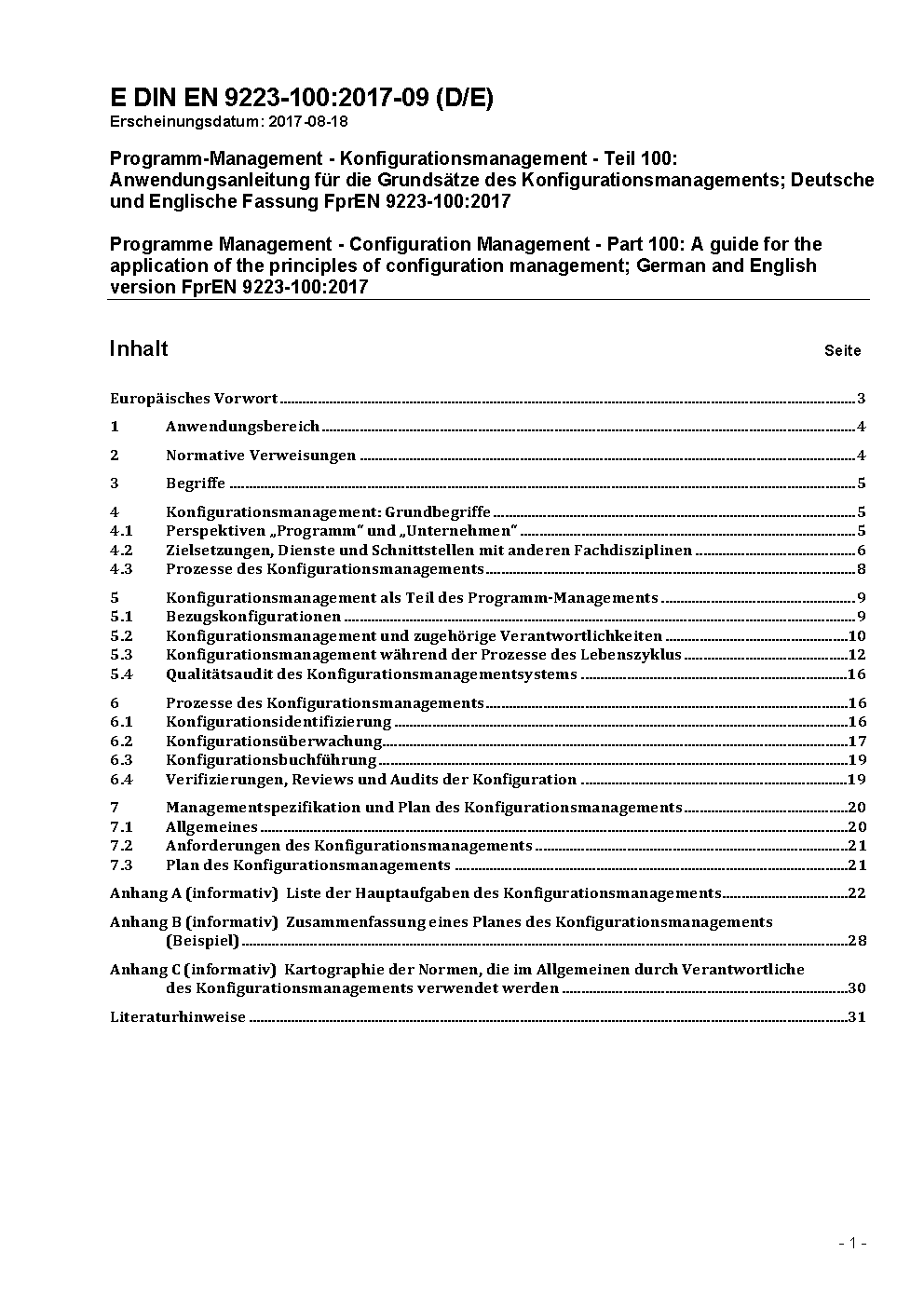 Programm-Management - Konfigurationsmanagement - Teil 100: Anwendungsanleitung für die Grundsätze des Konfigurationsmanagements; Deutsche und Englische Fassung EN 9223-100:2018