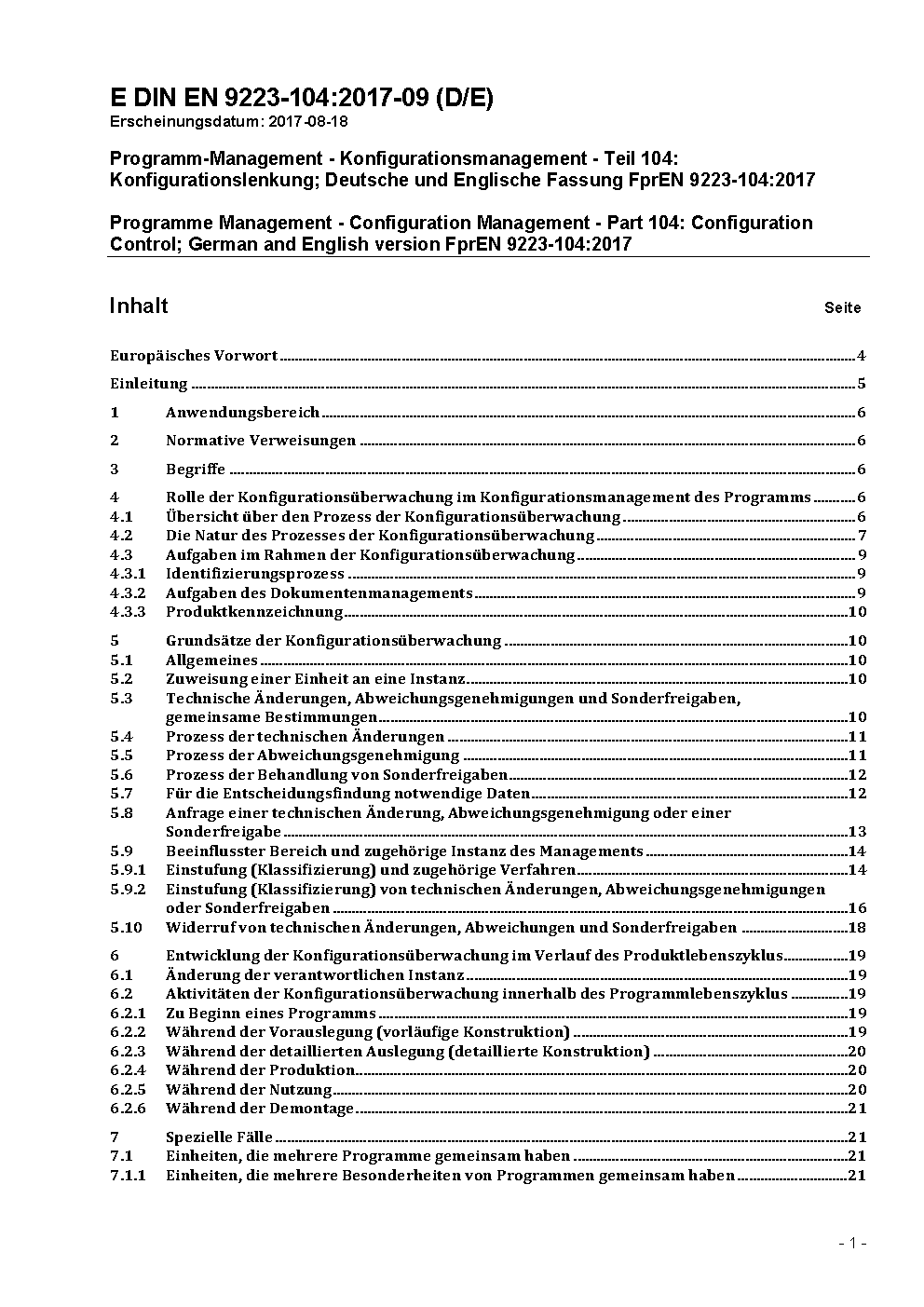 Programme Management - Configuration Management - Part 104: Configuration Control; German and English version EN 9223-104:2018