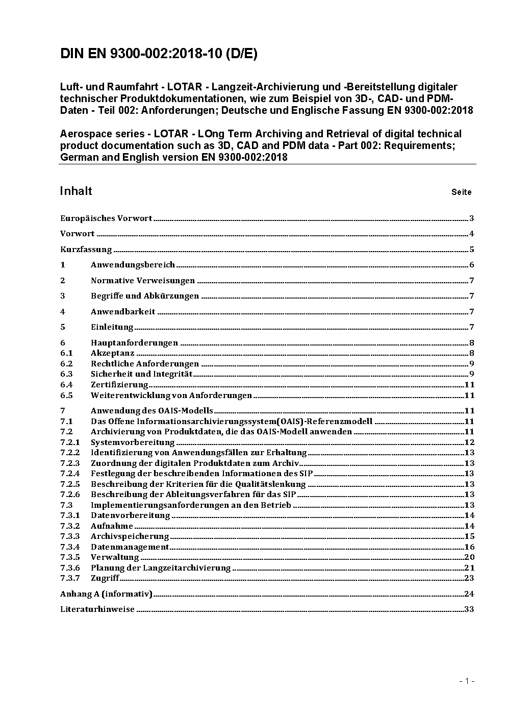 Aerospace series - LOTAR - LOng Term Archiving and Retrieval of digital technical product documentation such as 3D, CAD and PDM data - Part 002: Requirements; German and English version FprEN 9300-002:2017