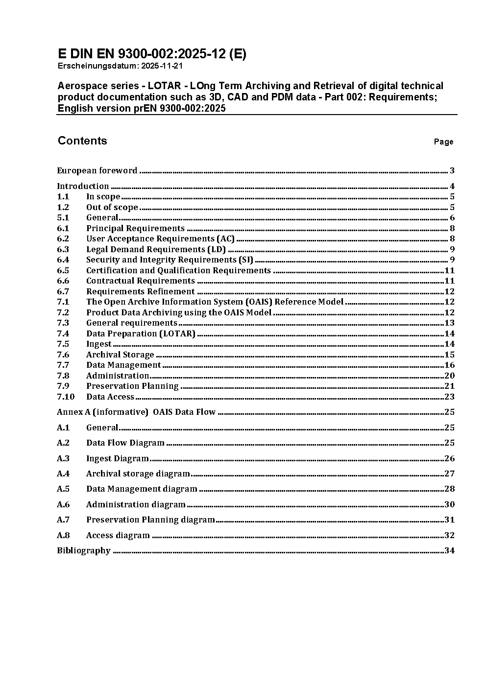 Luft- und Raumfahrt - LOTAR - Langzeit-Archivierung und -Bereitstellung digitaler technischer Produktdokumentationen, wie zum Beispiel von 3D-, CAD- und PDM-Daten - Teil 002: Anforderungen; Deutsche und Englische Fassung FprEN 9300-002:2017