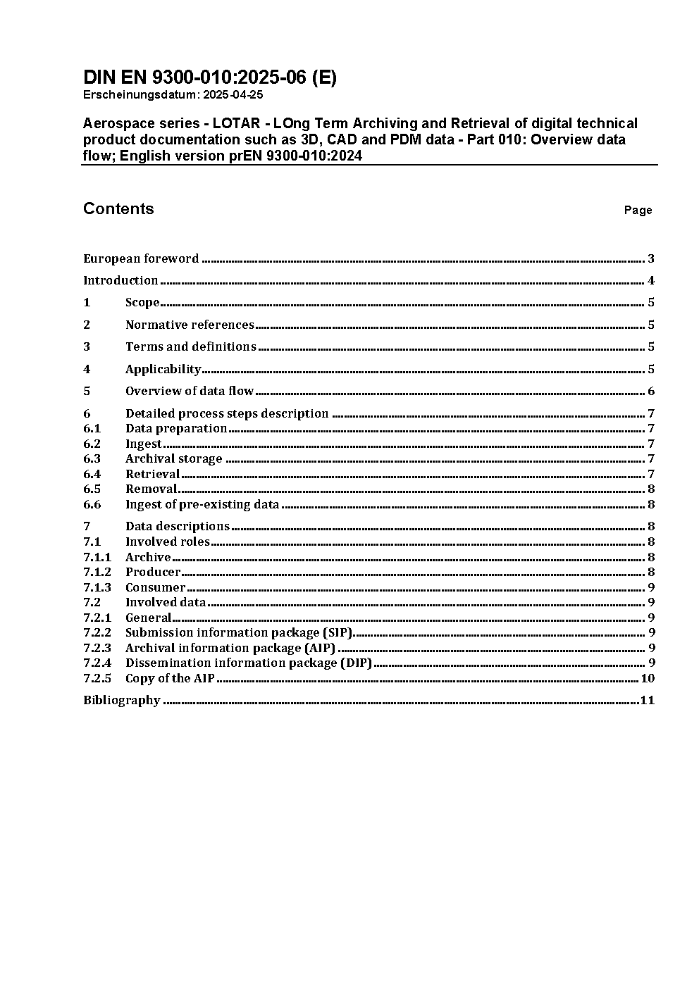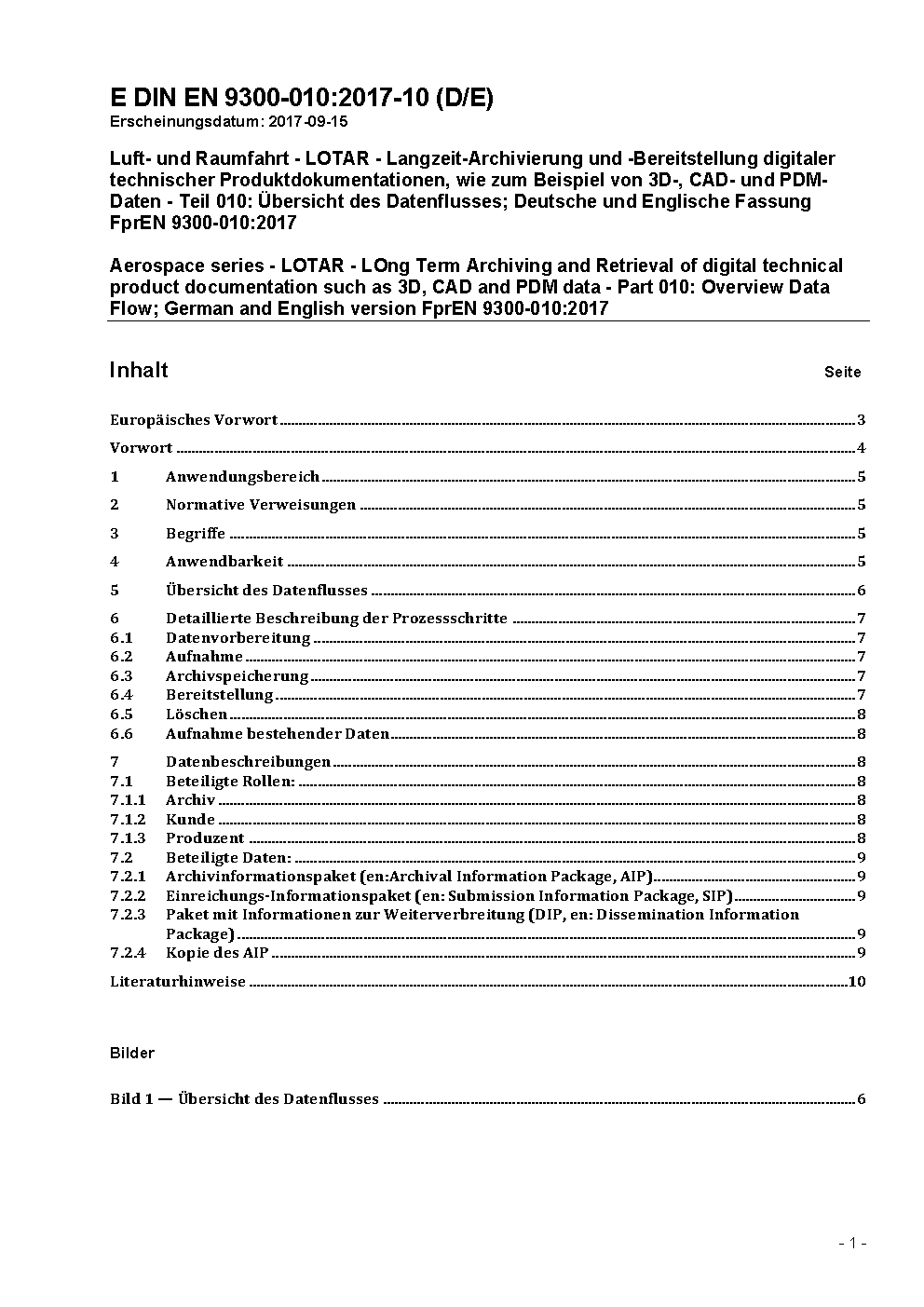 Aerospace series - LOTAR - LOng Term Archiving and Retrieval of digital technical product documentation such as 3D, CAD and PDM data - Part 010: Overview Data Flow; German and English version FprEN 9300-010:2017