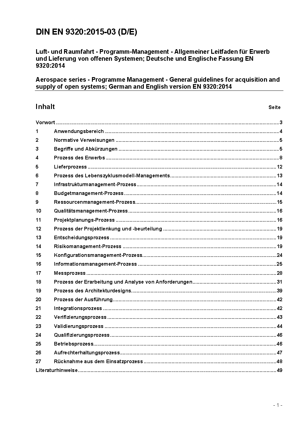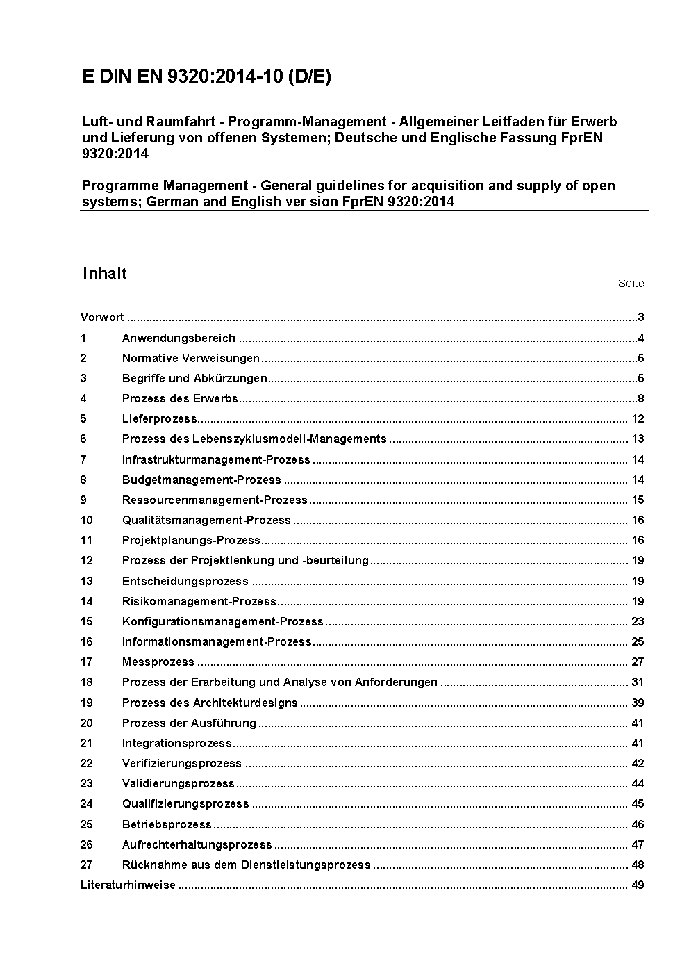 Luft- und Raumfahrt - Programm-Management - Allgemeiner Leitfaden für Erwerb und Lieferung von offenen Systemen; Deutsche und Englische Fassung EN 9320:2014