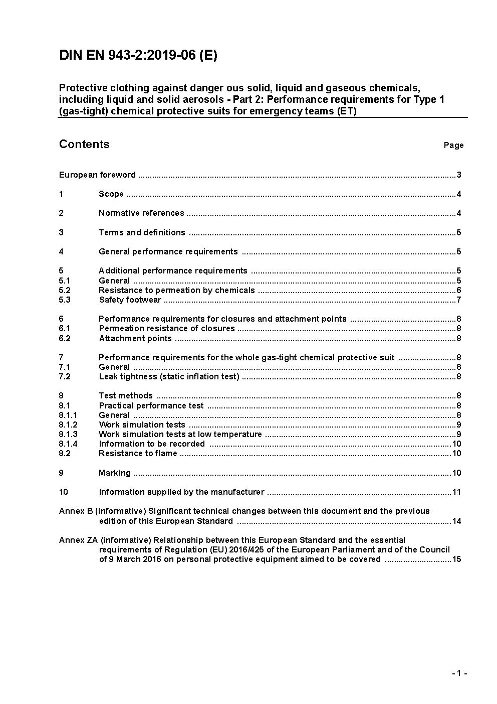 Protective clothing against liquid and gaseous chemicals, including liquid aerosols and solid particles - Part 2: Performance requirements for gas-tight (Type 1) chemical protective suits for emergency teams (ET); German version EN 943-2:2001