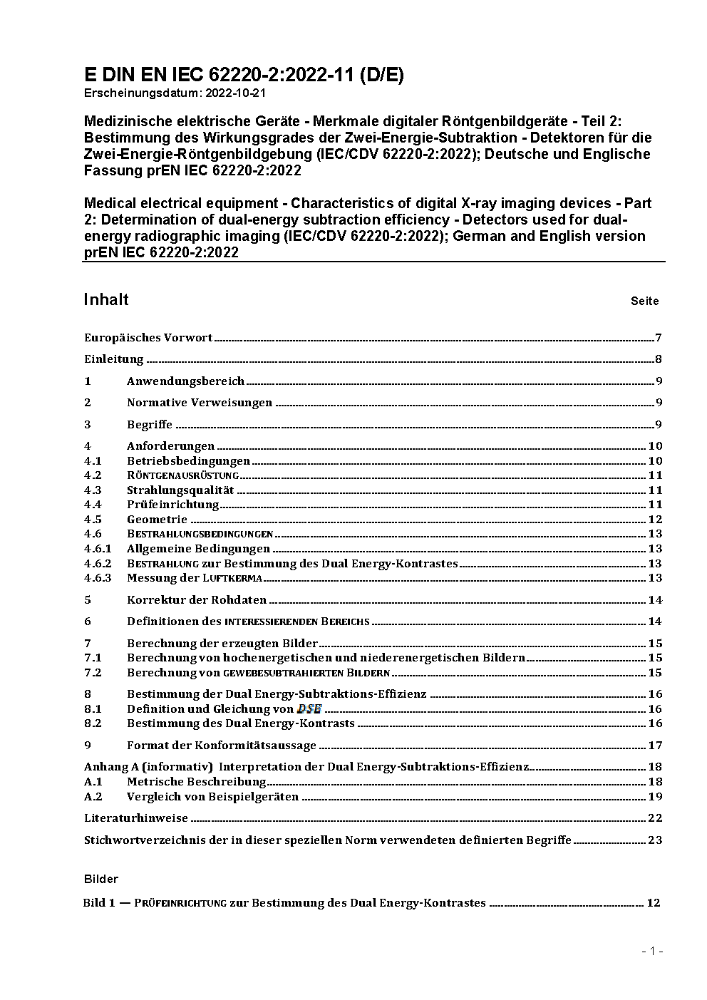 Medical electrical equipment - Characteristics of digital X-ray imaging devices - Part 2: Determination of dual-energy subtraction efficiency - Detectors used for dual-energy radiographic imaging (IEC/CDV 62220-2:2022); German and English version prEN IEC 62220-2:2022
