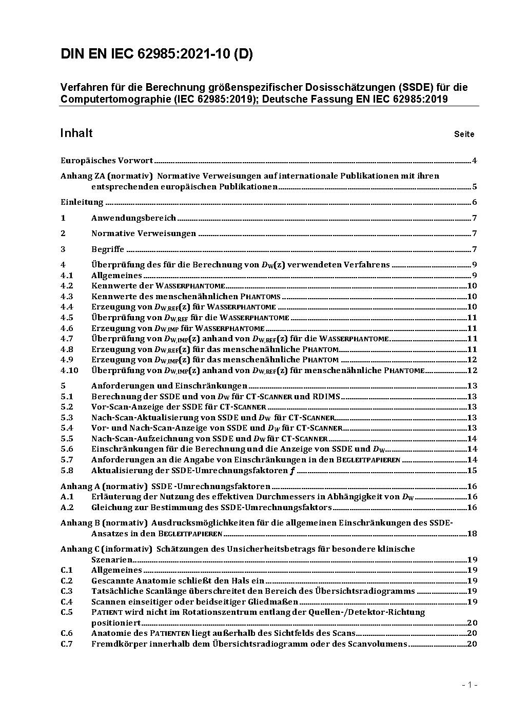 Verfahren für die Berechnung größenspezifischer Dosisschätzungen (SSDE) für die Computertomographie (IEC 62985:2019/COR1:2022); Deutsche Fassung EN IEC 62985:2019/AC:2022