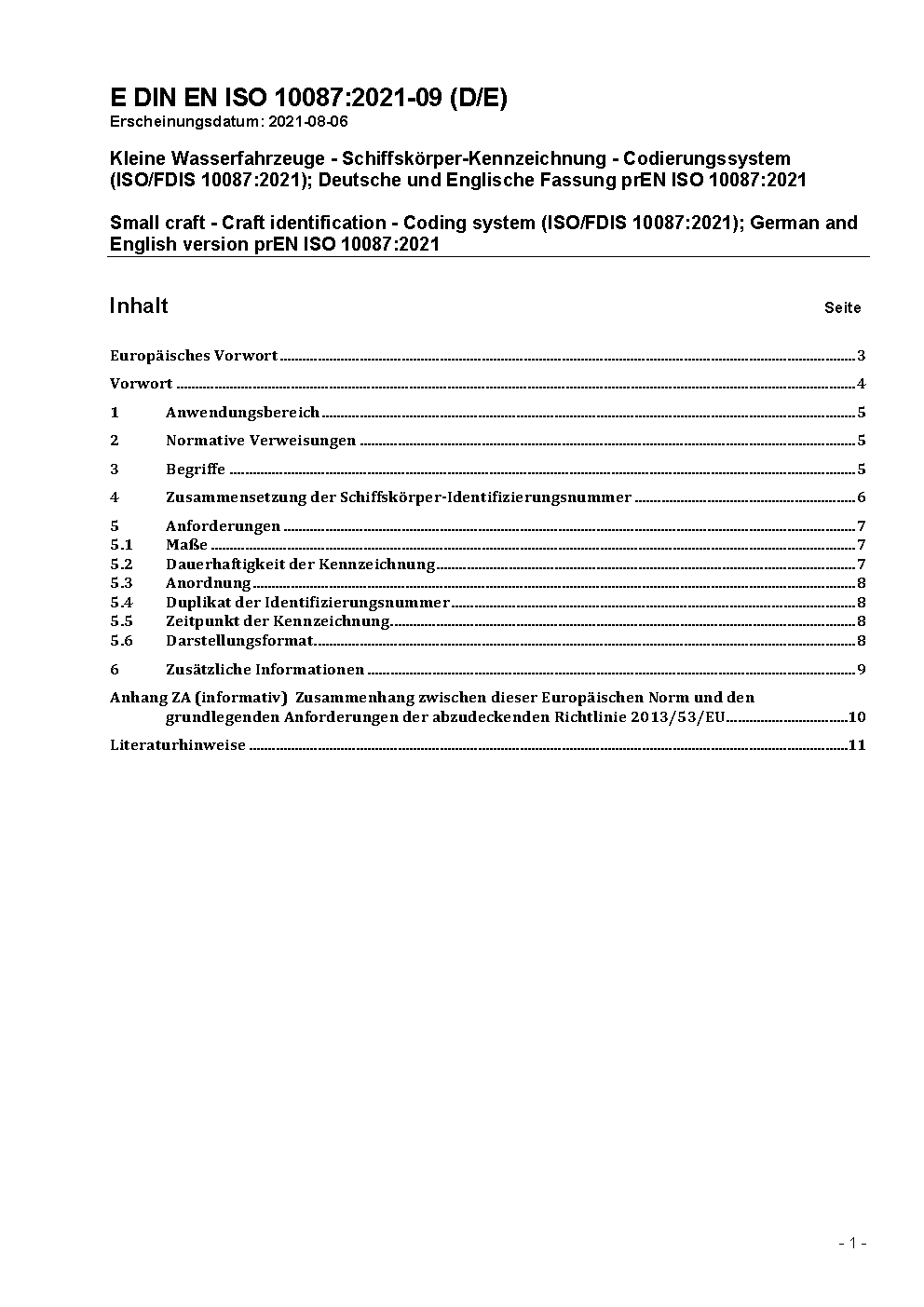 Kleine Wasserfahrzeuge - Schiffskörper-Kennzeichnung - Codierungssystem (ISO 10087:2006); Deutsche Fassung EN ISO 10087:2006