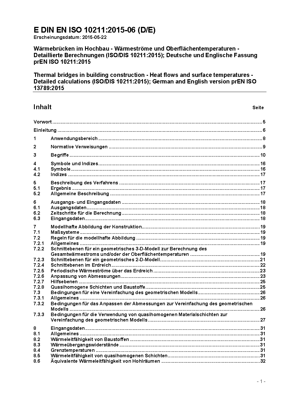 Wärmebrücken im Hochbau - Wärmeströme und Oberflächentemperaturen - Detaillierte Berechnungen (ISO 10211:2007); Deutsche Fassung EN ISO 10211:2007