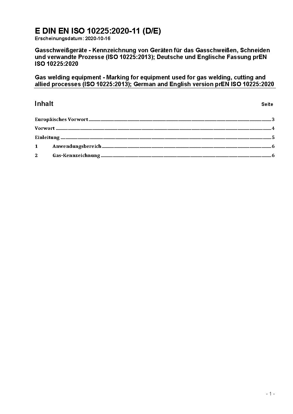 Gas welding equipment - Marking for equipment used for gas welding, cutting and allied processes (ISO 10225:2013); German and English version prEN ISO 10225:2020