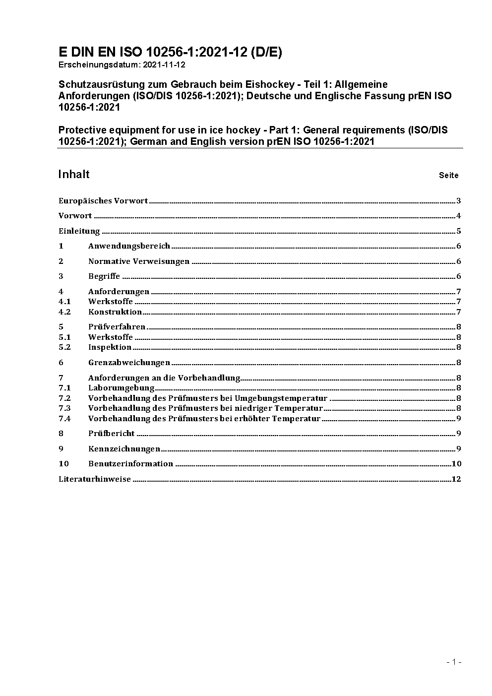 Protective equipment for use in ice hockey - Part 1: General requirements (ISO/DIS 10256-1:2021); German and English version prEN ISO 10256-1:2021
