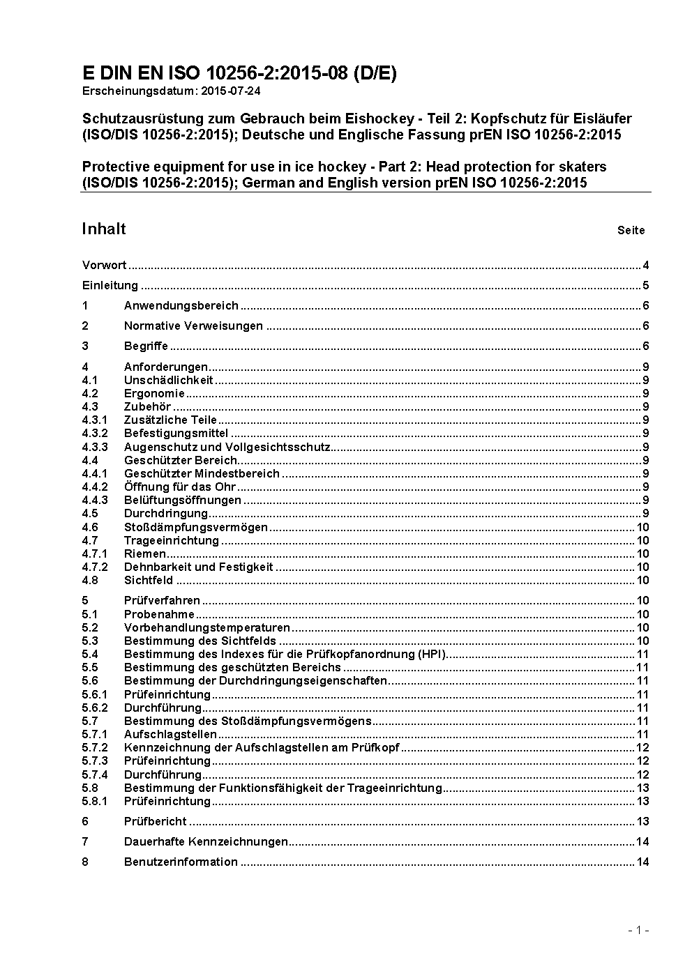 Protective equipment for use in ice hockey - Part 2: Head protection for skaters (ISO/DIS 10256-2:2015); German and English version prEN ISO 10256-2:2015