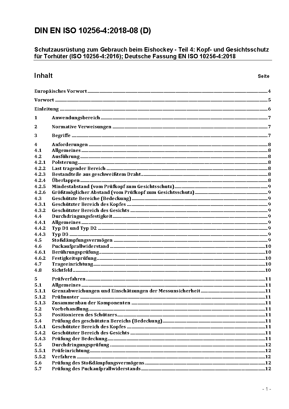 Protective equipment for use in ice hockey - Part 4: Head and face protection for goalkeepers (ISO/DIS 10256-4:2021); German and English version prEN ISO 10256-4:2021