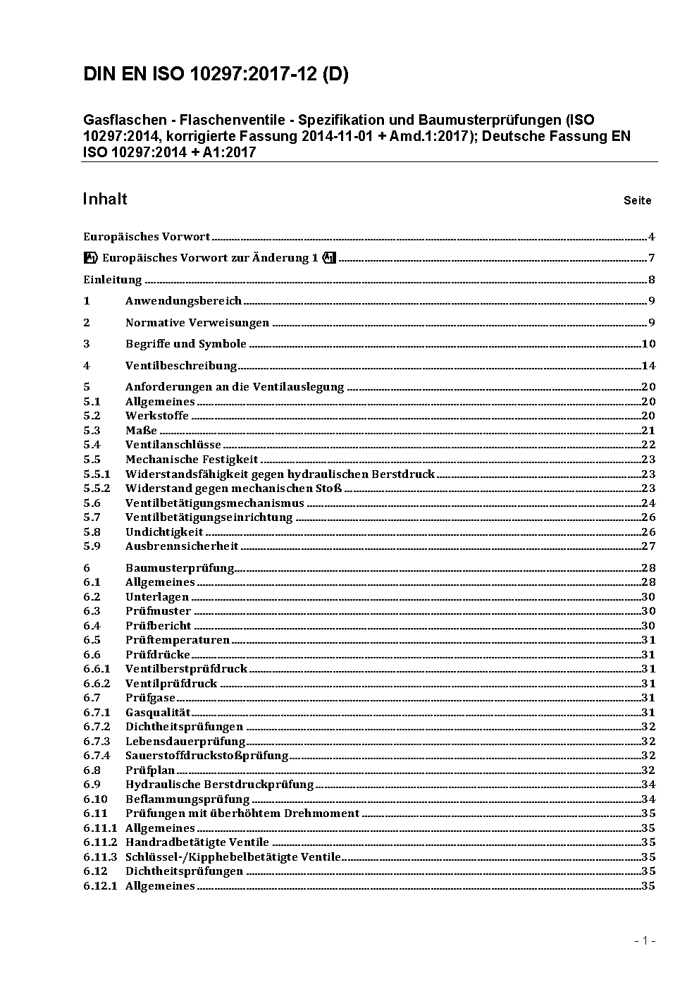 Gasflaschen - Flaschenventile - Spezifikation und Baumusterprüfungen (ISO 10297:2014, korrigierte Fassung 2014-11-01 + Amd.1:2017); Deutsche Fassung EN ISO 10297:2014 + A1:2017