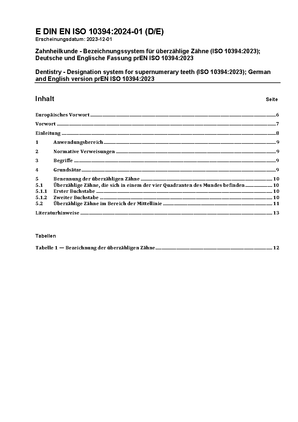 Zahnheilkunde - Bezeichnungssystem für überzählige Zähne (ISO 10394:2023); Deutsche und Englische Fassung prEN ISO 10394:2023