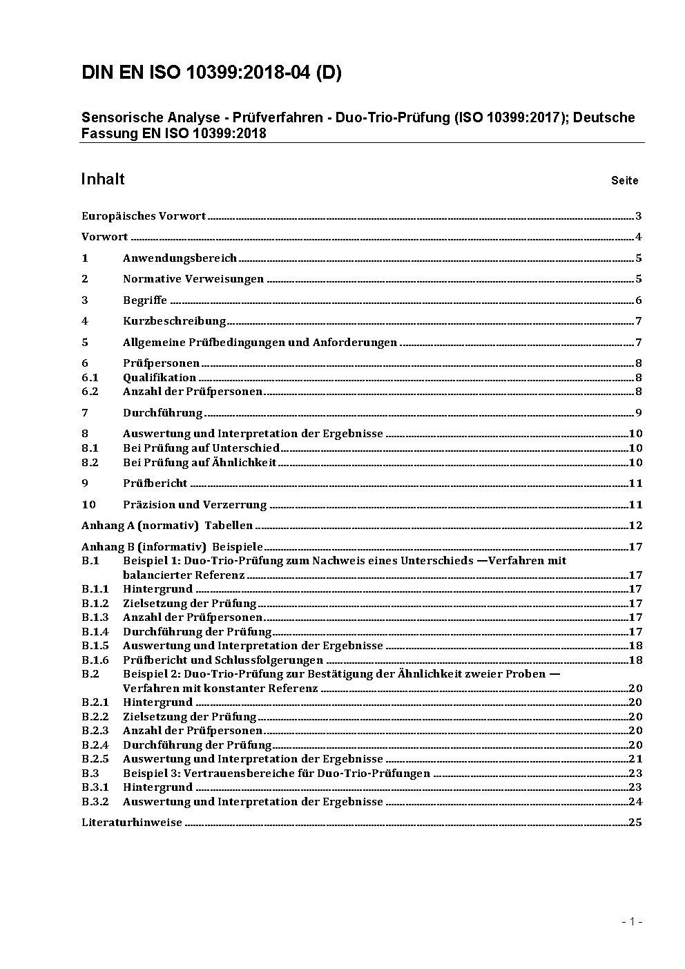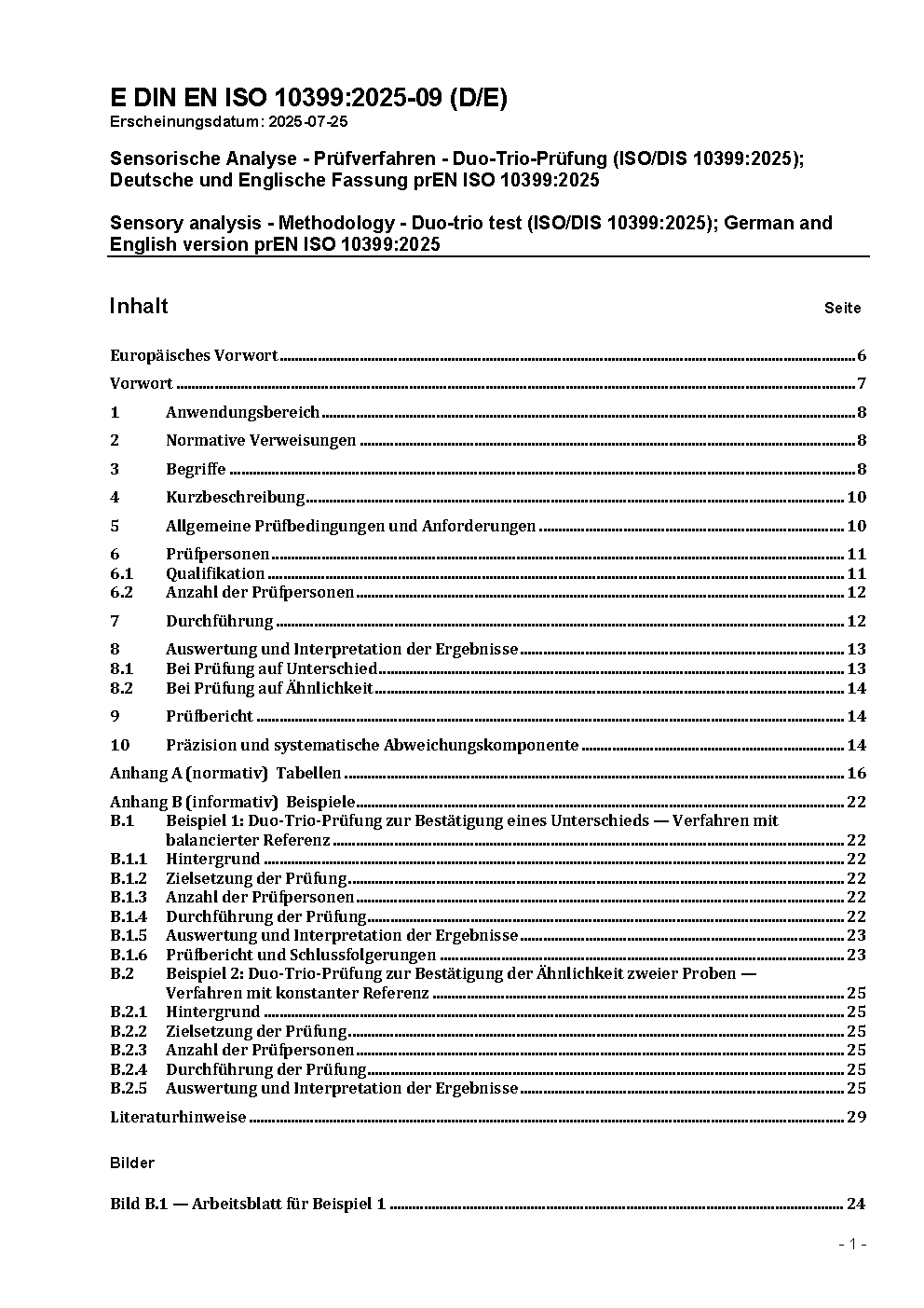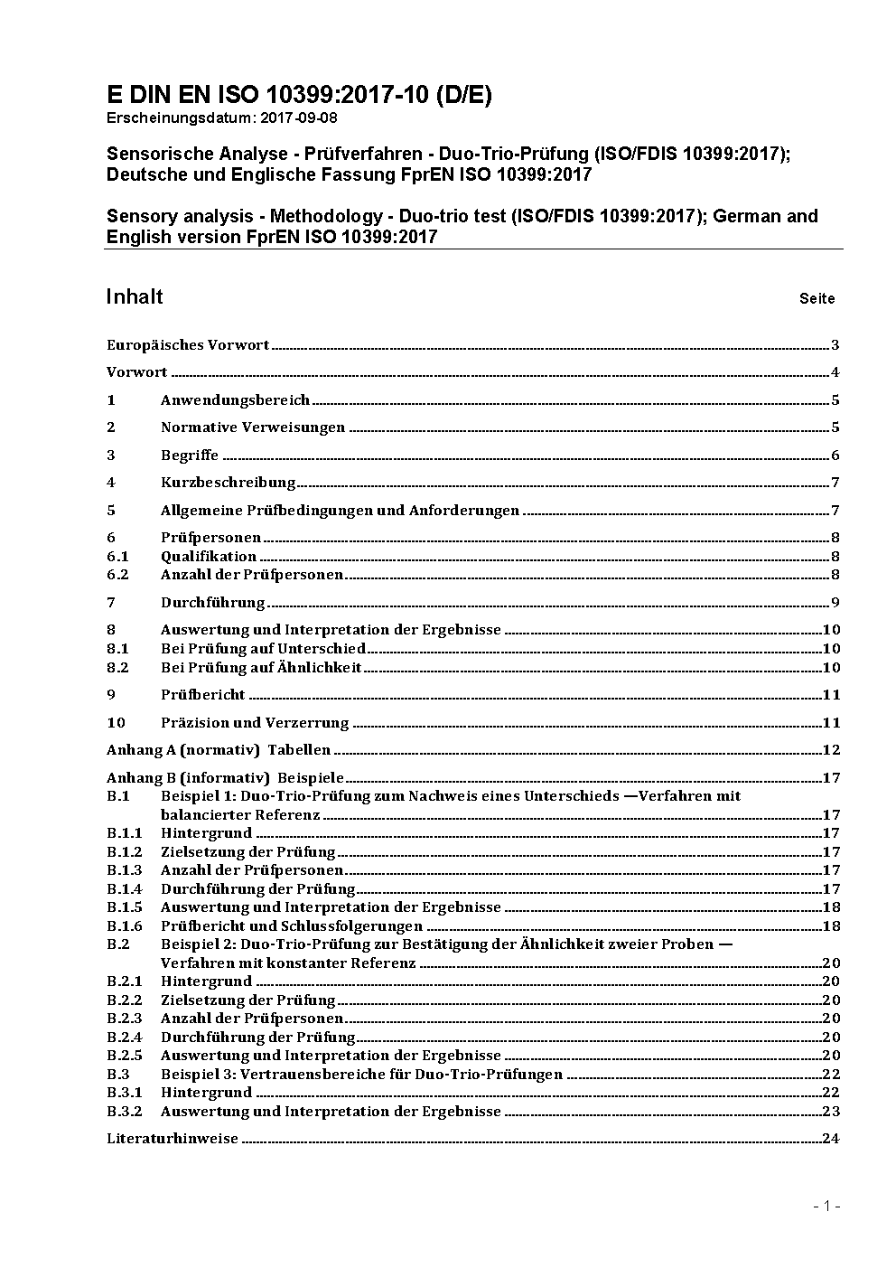 Sensory analysis - Methodology - Duo-trio test (ISO/FDIS 10399:2017); German and English version FprEN ISO 10399:2017