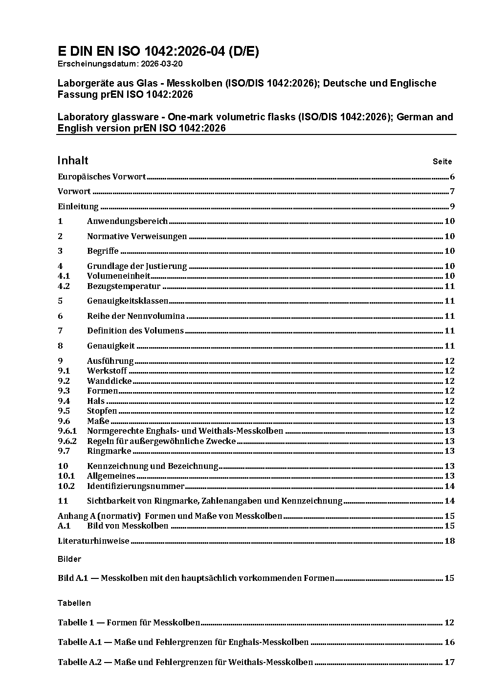 Laboratory glassware - One-mark volumetric flasks (ISO 1042:1997); German version prEN ISO 1042:1998