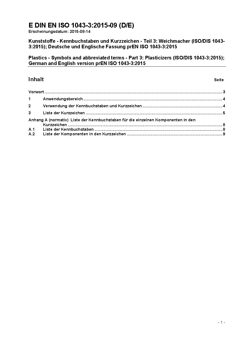 Plastics - Symbols and abbreviated terms - Part 3: Plasticizers (ISO/DIS 1043-3:2015); German and English version prEN ISO 1043-3:2015