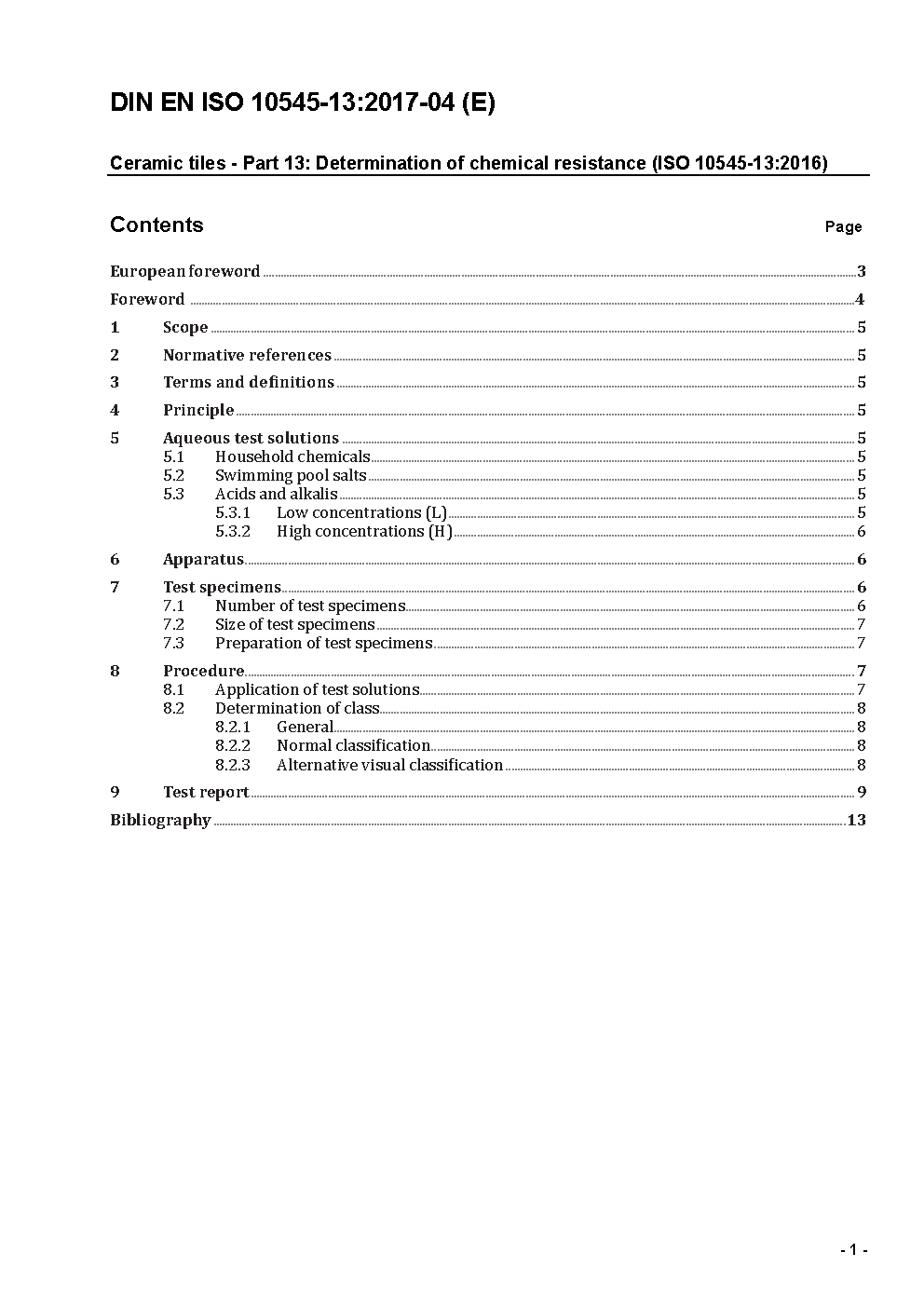 Keramische Fliesen und Platten - Teil 13: Bestimmung der chemischen Beständigkeit (ISO 10545-13:1995); Deutsche Fassung EN ISO 10545-13:1997