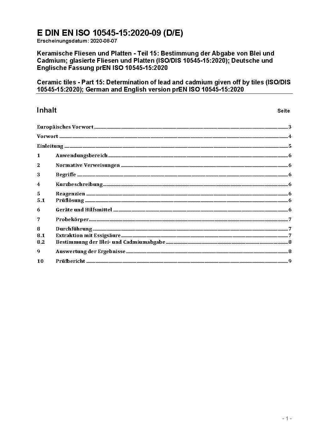 Ceramic tiles - Part 15: Determination of lead and cadmium given off by tiles (ISO/DIS 10545-15:2020); German and English version prEN ISO 10545-15:2020