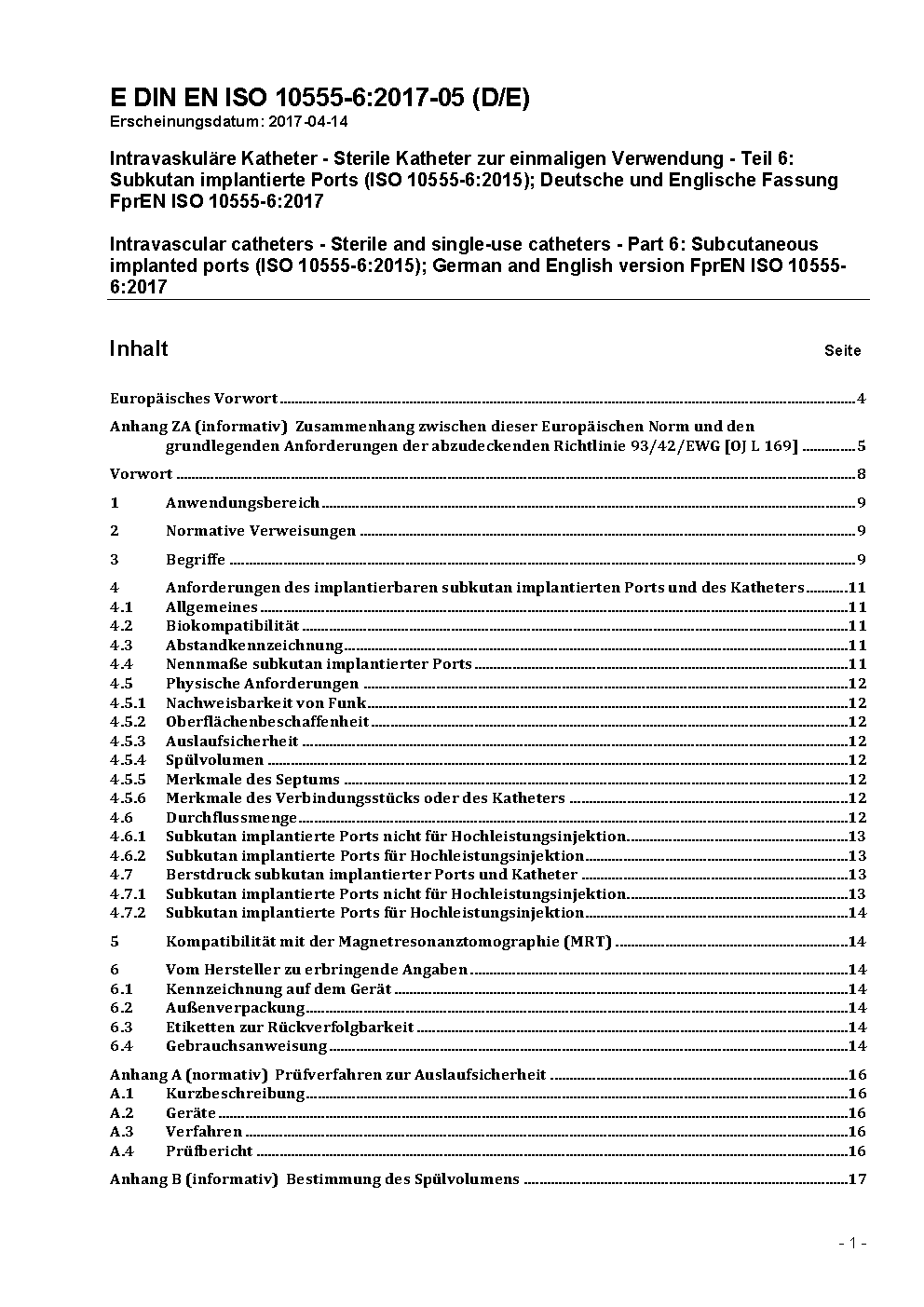 Intravaskuläre Katheter - Sterile Katheter zur einmaligen Verwendung - Teil 6: Subkutan implantierte Ports (ISO 10555-6:2015); Deutsche Fassung EN ISO 10555-6:2017