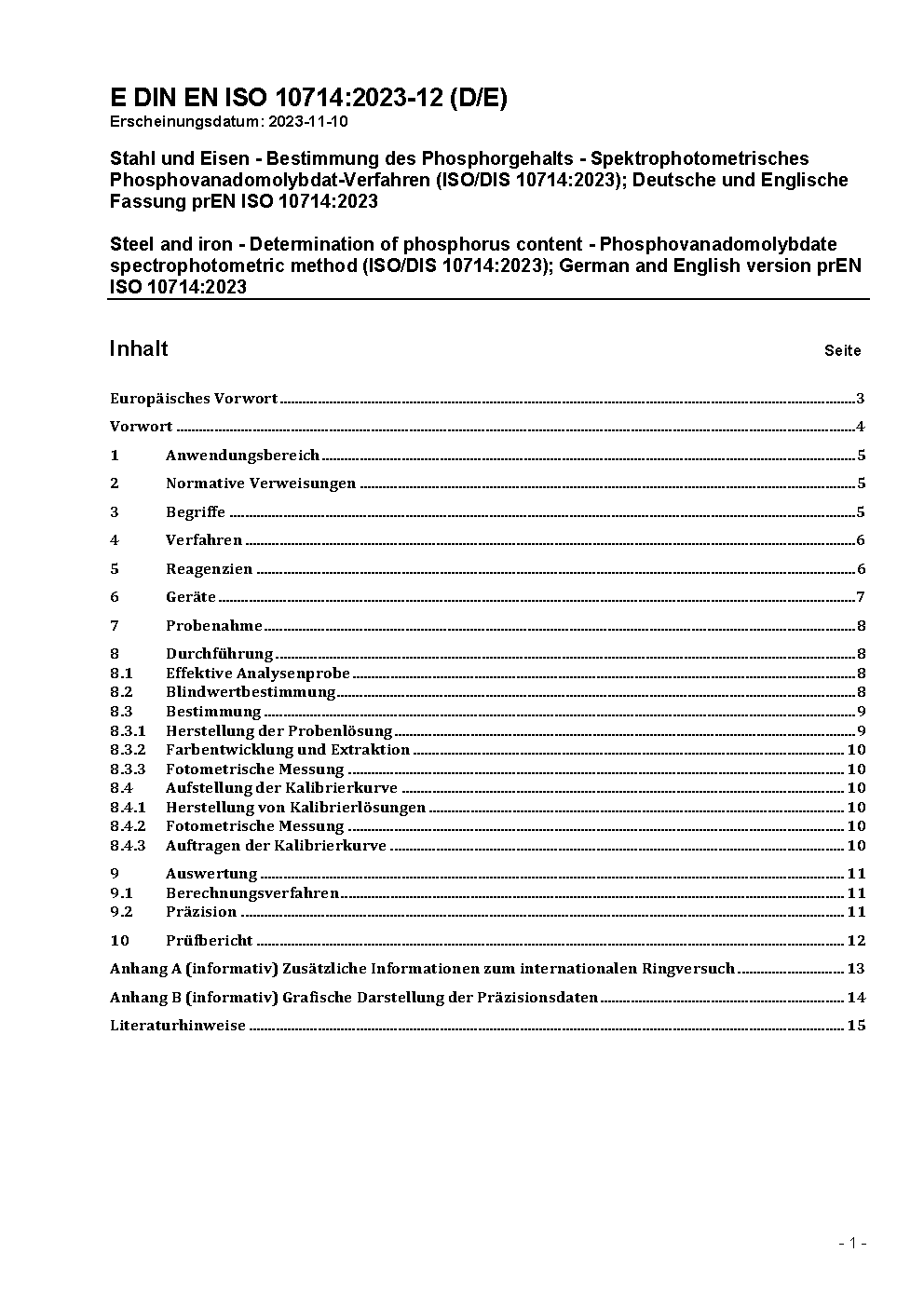 Eisen und Stahl - Bestimmung des Phosporgehaltes - Fotometrische Bestimmung; Vanadatomolybdatophosphat-Verfahren (ISO 10714:1992); Deutsche Fassung EN ISO 10714:2002