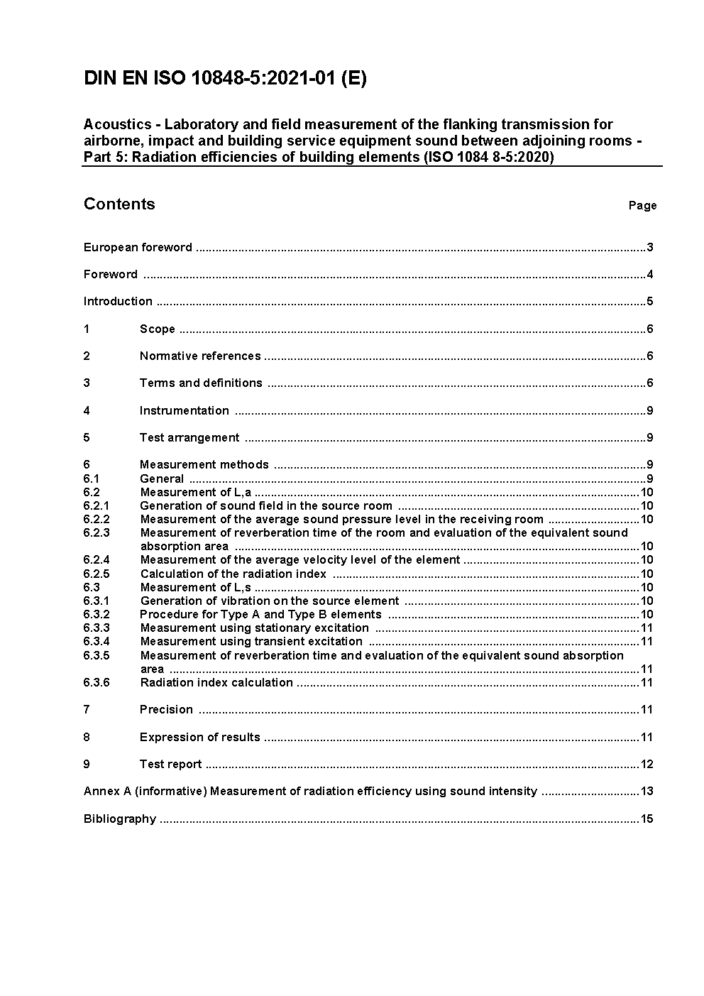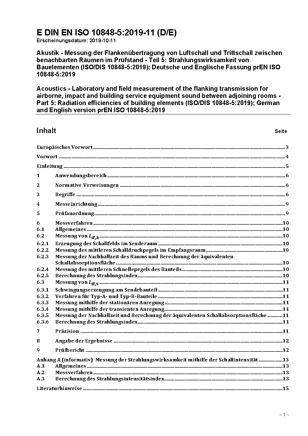 Acoustics - Laboratory and field measurement of the flanking transmission for airborne, impact and building service equipment sound between adjoining rooms - Part 5: Radiation efficiencies of building elements (ISO/DIS 10848-5:2019); German and English version prEN ISO 10848-5:2019