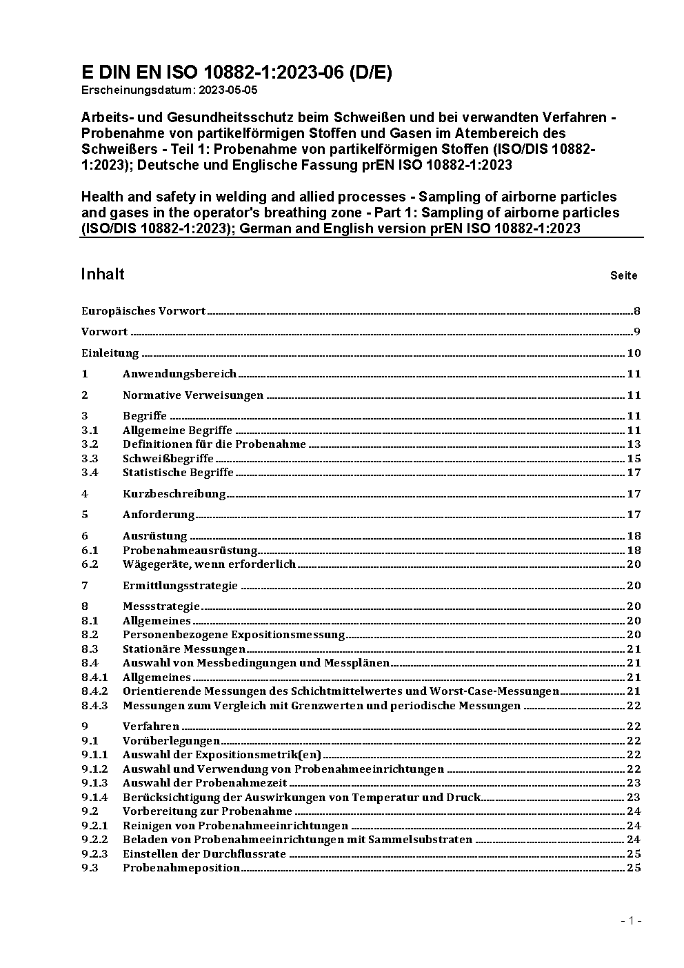 Arbeits- und Gesundheitsschutz beim Schweißen und bei verwandten Verfahren - Probenahme von partikelförmigen Stoffen und Gasen im Atembereich des Schweißers - Teil 1: Probenahme von partikelförmigen Stoffen (ISO 10882-1:2024); Deutsche Fassung EN ISO 10882-1:2024