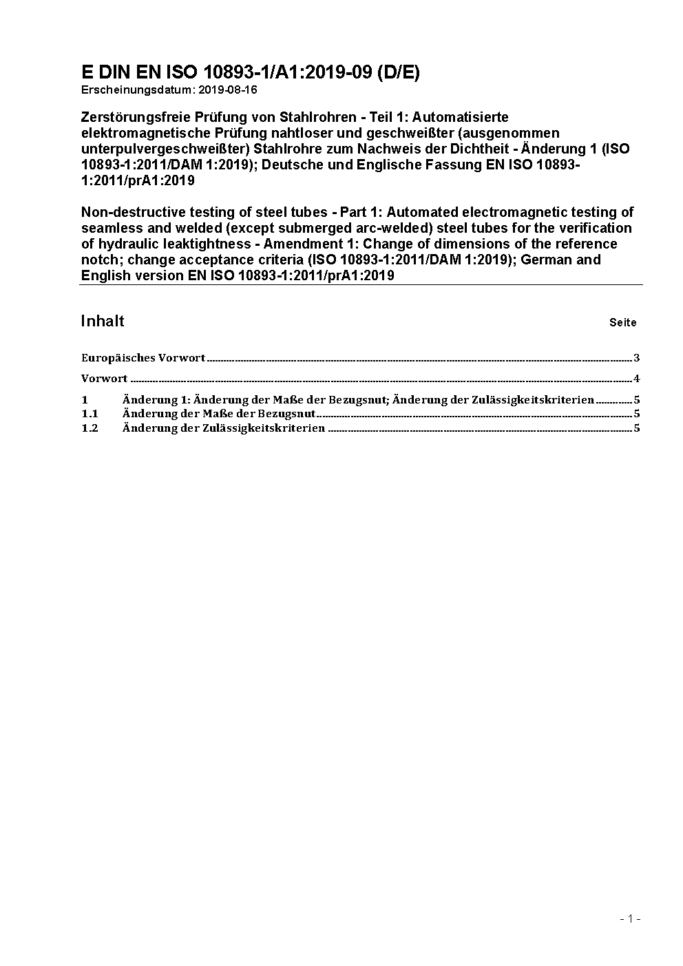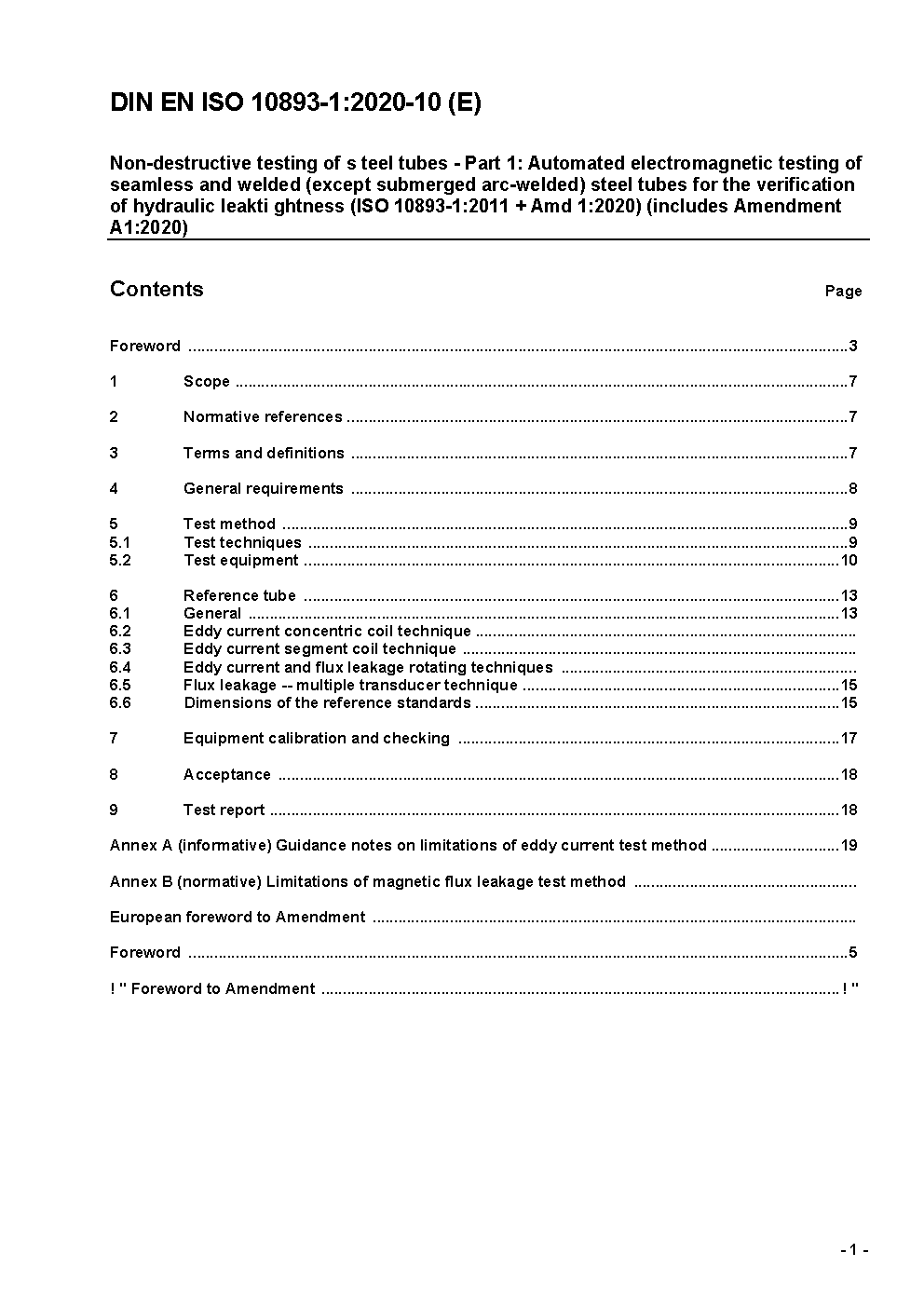 Non-destructive testing of steel tubes - Part 1: Automated electromagnetic testing of seamless and welded (except submerged arc-welded) steel tubes for the verification of hydraulic leaktightness (ISO 10893-1:2011 + Amd 1:2020); German version EN ISO 10893-1:2011 + A1:2020