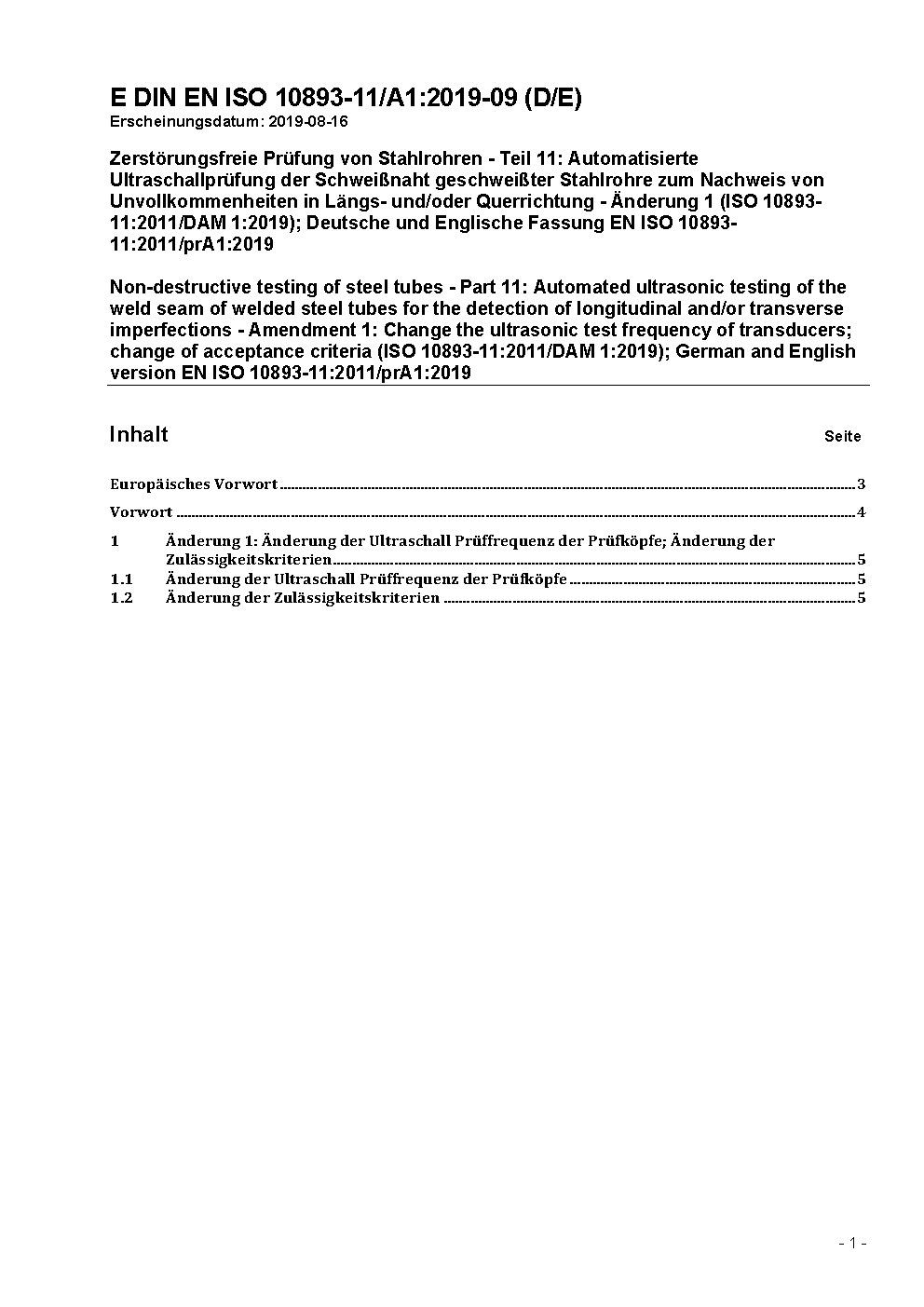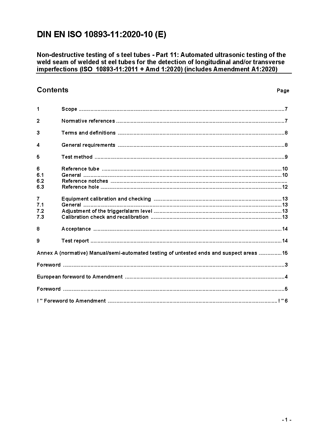 Non-destructive testing of steel tubes - Part 11: Automated ultrasonic testing of the weld seam of welded steel tubes for the detection of longitudinal and/or transverse imperfections (ISO 10893-11:2011 + Amd 1:2020); German version EN ISO 10893-11:2011 + A1:2020