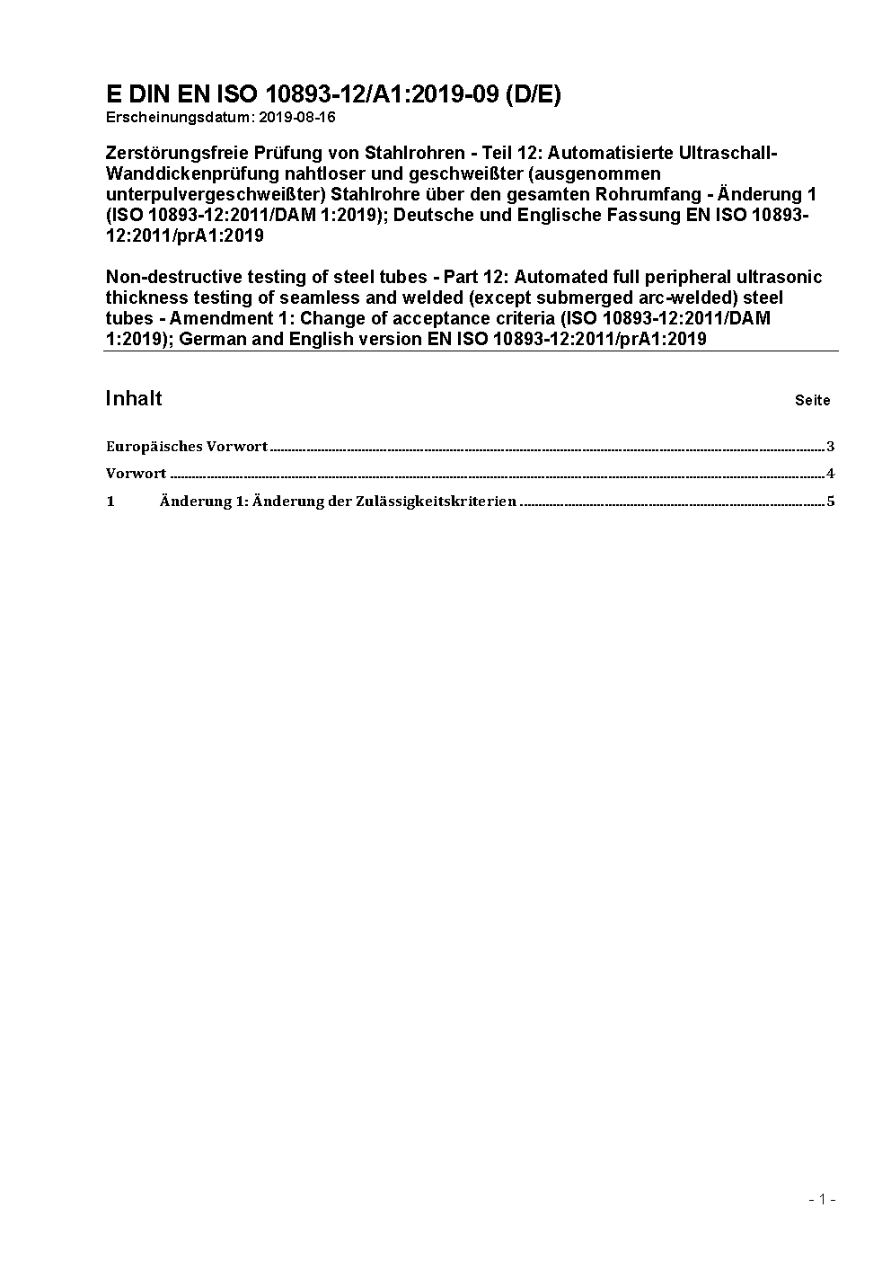 Zerstörungsfreie Prüfung von Stahlrohren - Teil 12: Automatisierte Ultraschall-Wanddickenprüfung nahtloser und geschweißter (ausgenommen unterpulvergeschweißter) Stahlrohre über den gesamten Rohrumfang (ISO 10893-12:2011 + Amd 1:2020); Deutsche Fassung EN ISO 10893-12:2011 + A1:2020