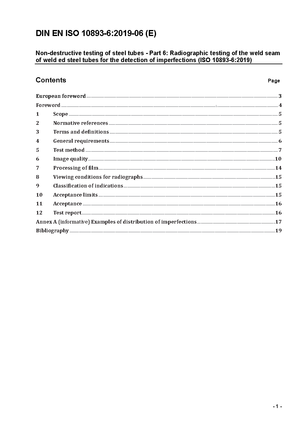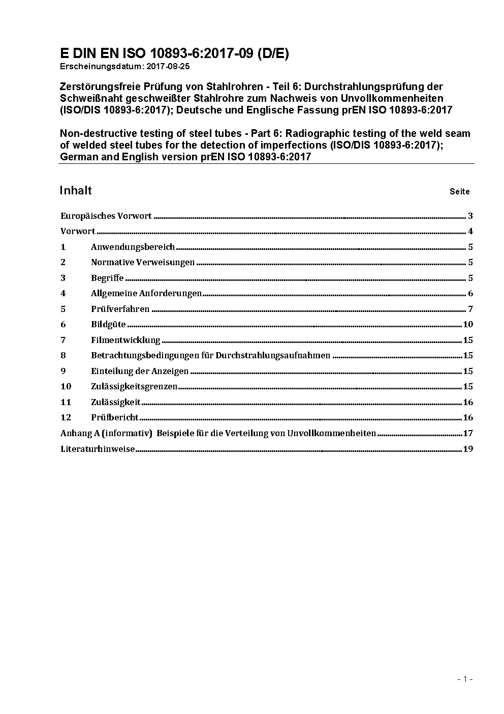 Zerstörungsfreie Prüfung von Stahlrohren - Teil 6: Durchstrahlungsprüfung der Schweißnaht geschweißter Stahlrohre zum Nachweis von Unvollkommenheiten (ISO 10893-6:2019); Deutsche Fassung EN ISO 10893-6:2019