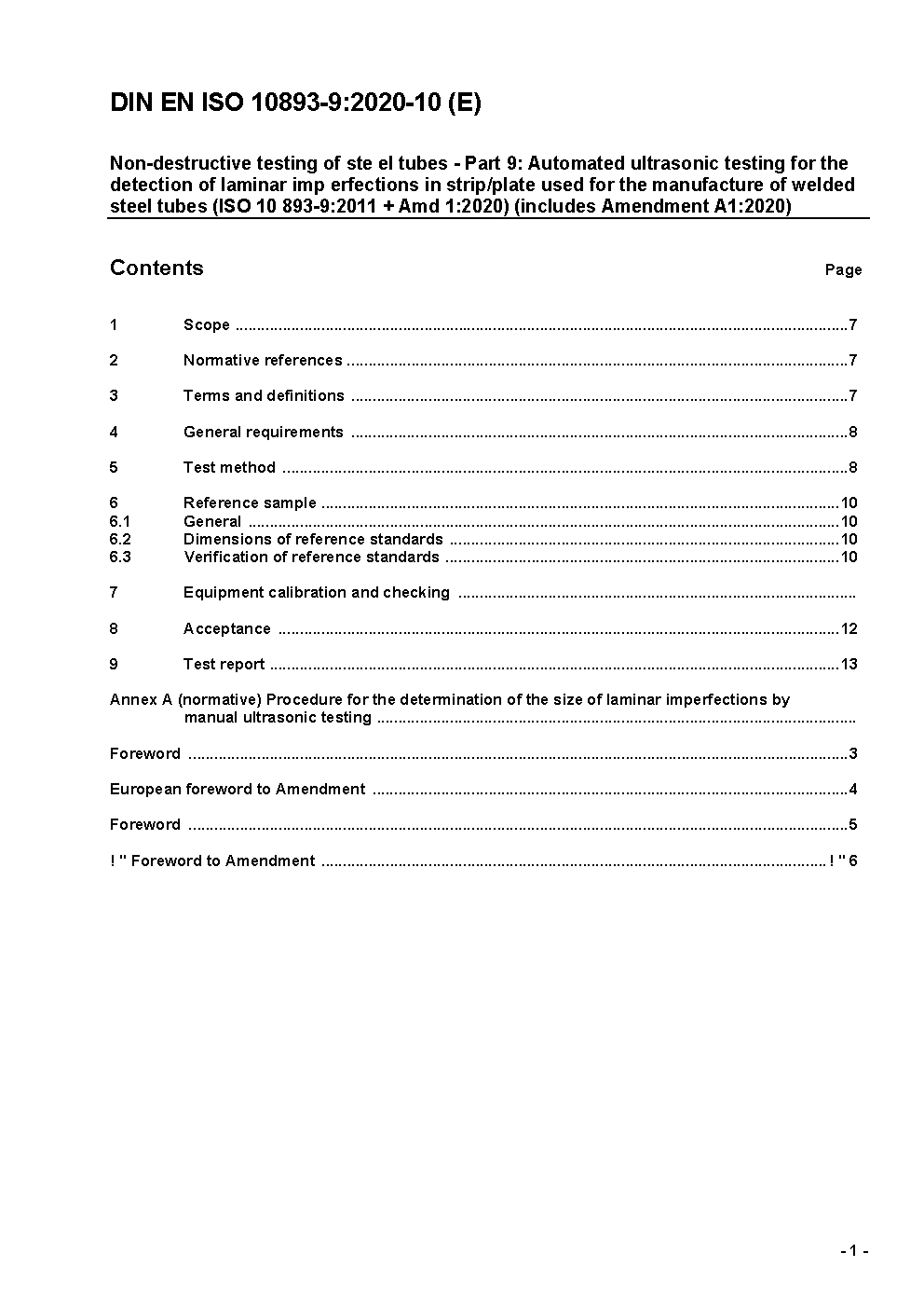 Zerstörungsfreie Prüfung von Stahlrohren - Teil 9: Automatisierte Ultraschallprüfung von Band/Blech, das für die Herstellung geschweißter Stahlrohre eingesetzt wird, zum Nachweis von Dopplungen (ISO 10893-9:2011 + Amd 1:2020); Deutsche Fassung EN ISO 10893-9:2011 + A1:2020