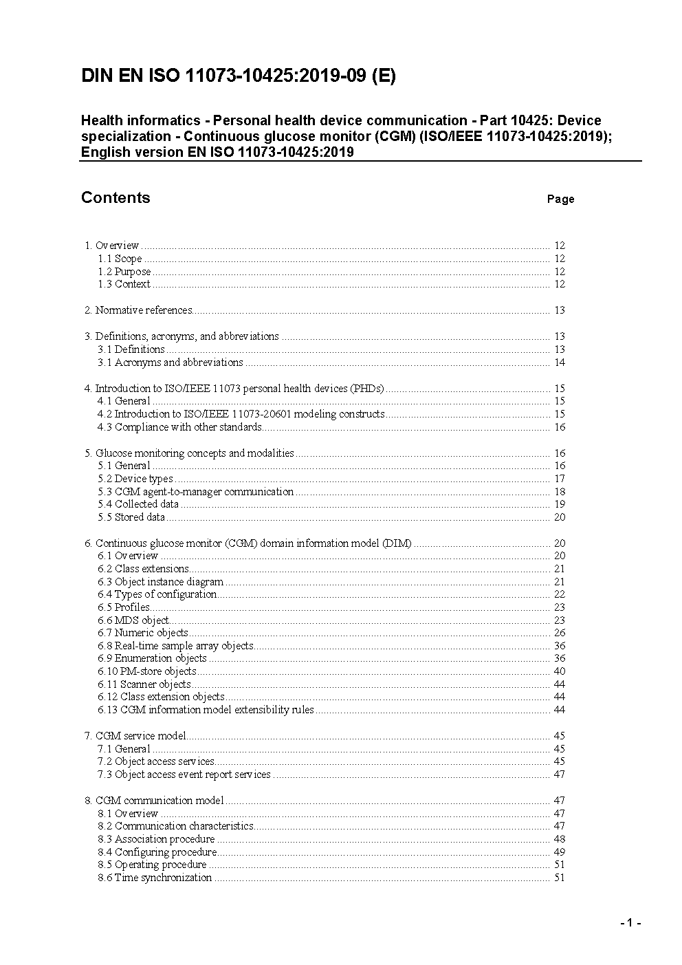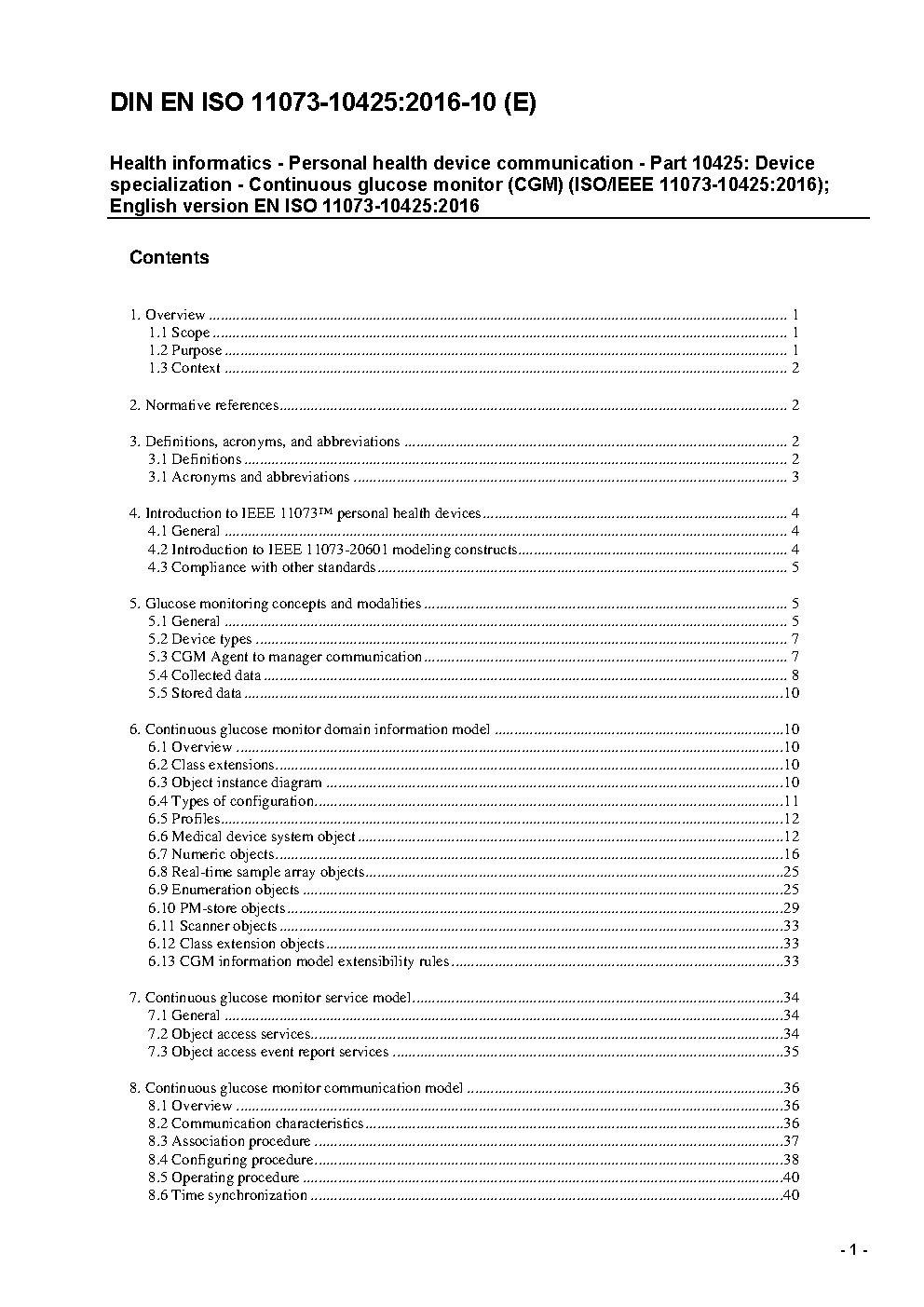 Medizinische Informatik - Kommunikation von Geräten für die persönliche Gesundheit - Teil 10425: Gerätespezifikation - Kontinuierlicher Glukose-Monitor (ISO/IEEE 11073-10425:2016); Englische Fassung EN ISO 11073-10425:2016