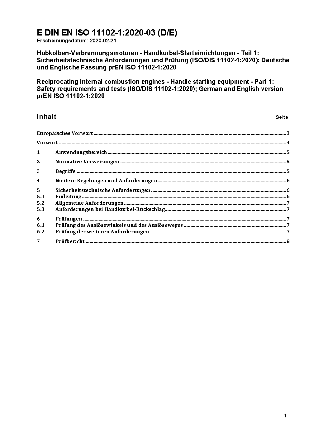Verbrennungsmotoren - Handkurbel-Starteinrichtungen - Teil 1: Sicherheitstechnische Anforderungen und Prüfung (ISO 11102-1:1997); Deutsche Fassung EN ISO 11102-1:1997