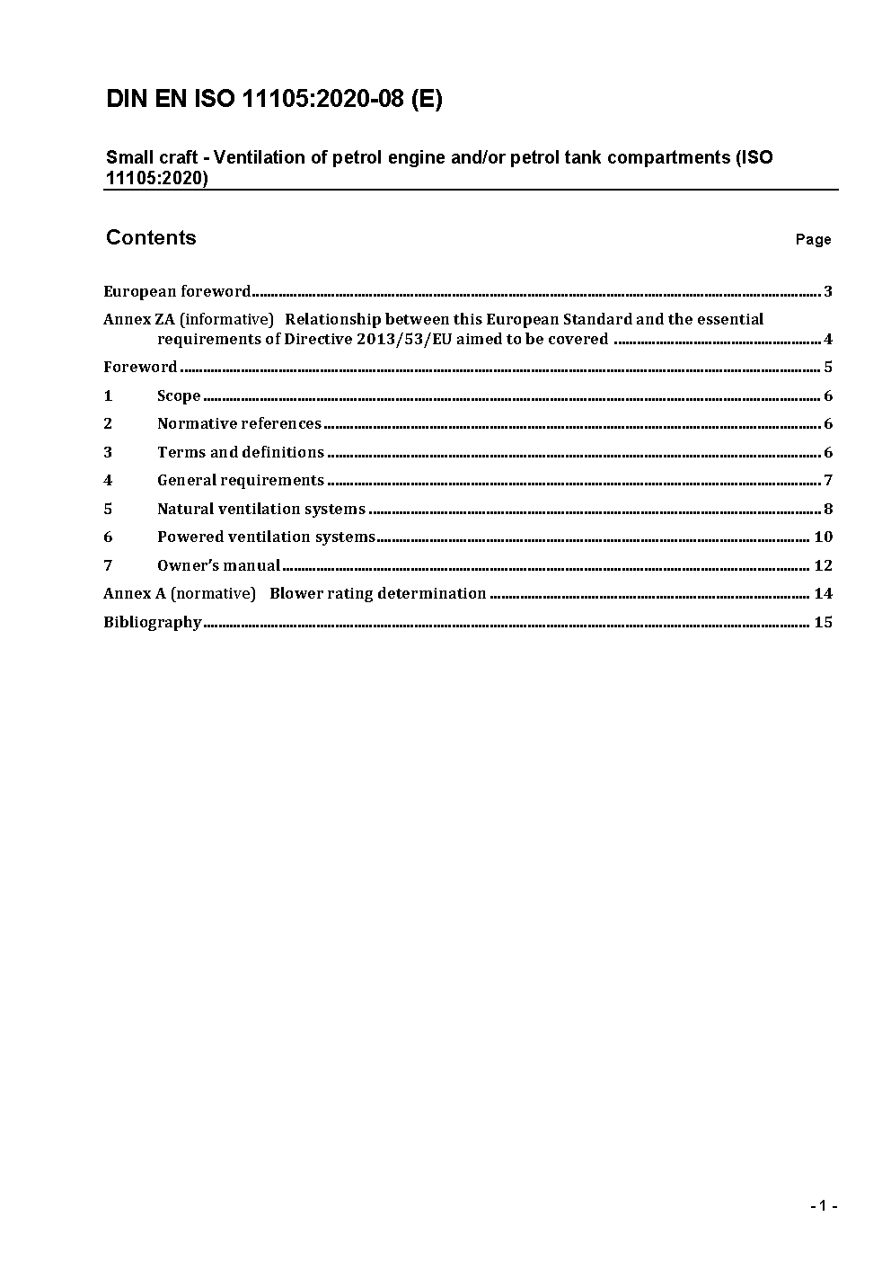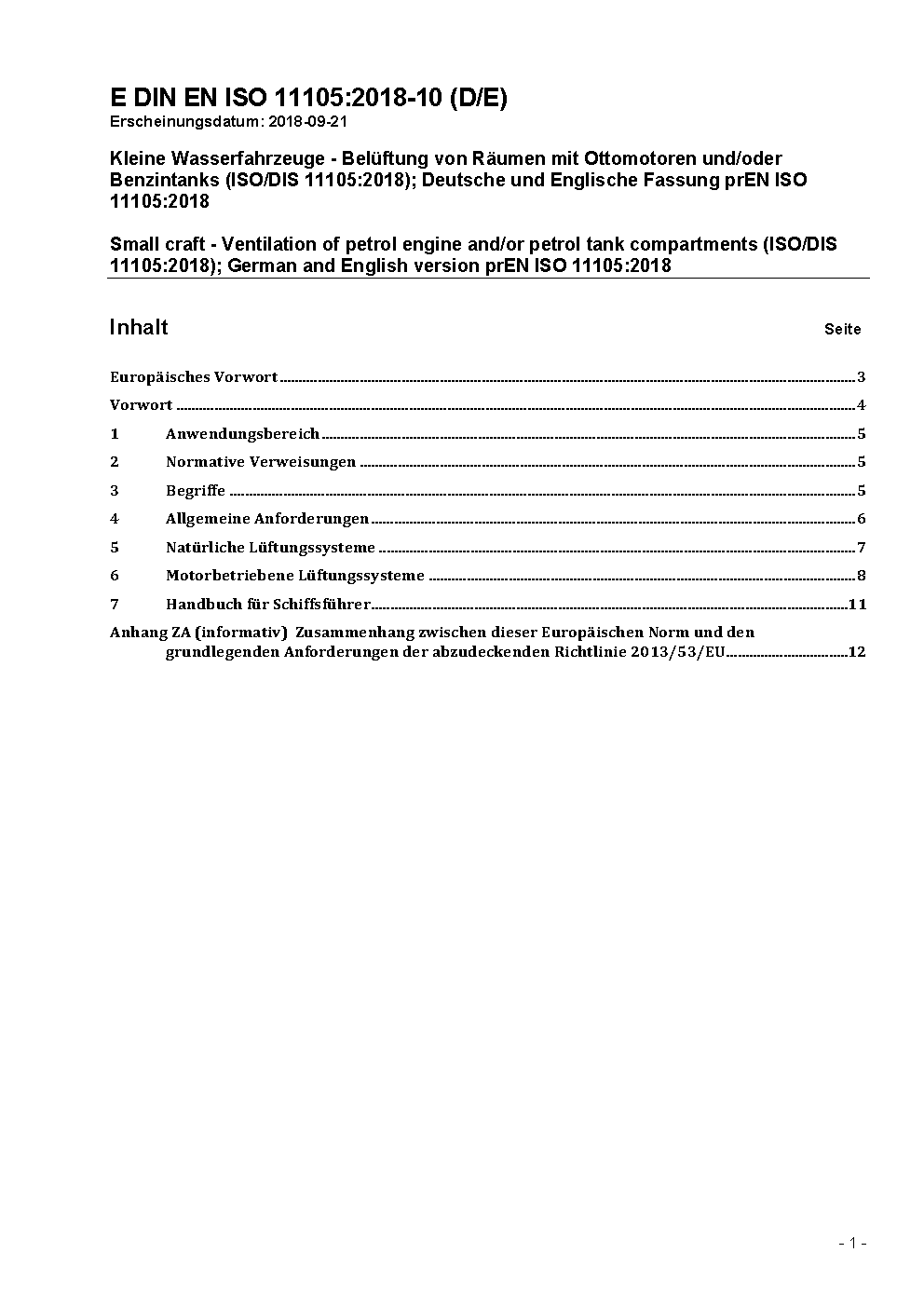Kleine Wasserfahrzeuge - Belüftung von Räumen mit Ottomotoren und/oder Benzintanks (ISO 11105:1997); Deutsche Fassung EN ISO 11105:2017; Änderung A100