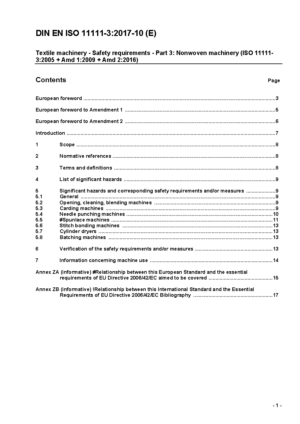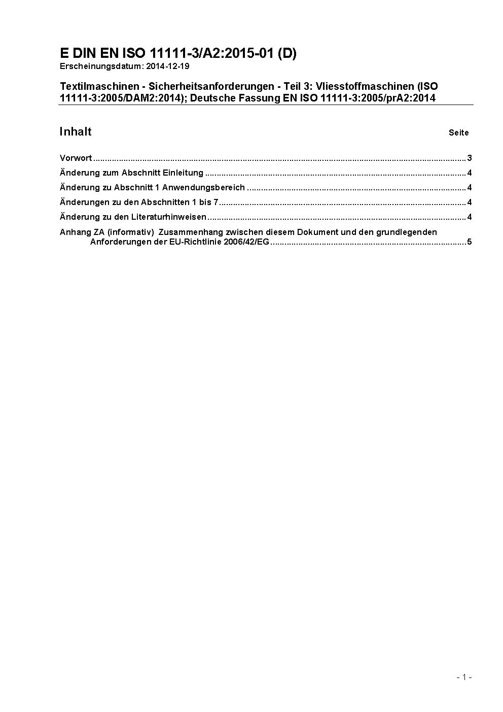 Textilmaschinen - Sicherheitsanforderungen - Teil 3: Vliesstoffmaschinen (ISO 11111-3:2005 + Amd 1:2009); Deutsche Fassung EN ISO 11111-3:2005 + A1:2009 / Achtung: Daneben gilt DIN EN ISO 11111-3 (2005-06) noch bis 2009-12-28.*Übergangsfrist, festgelegt durch DIN EN ISO 11111-3 (2016-12) und DIN EN ISO 11111-3 (2017-10), bis 2016-12-31 beachten.
