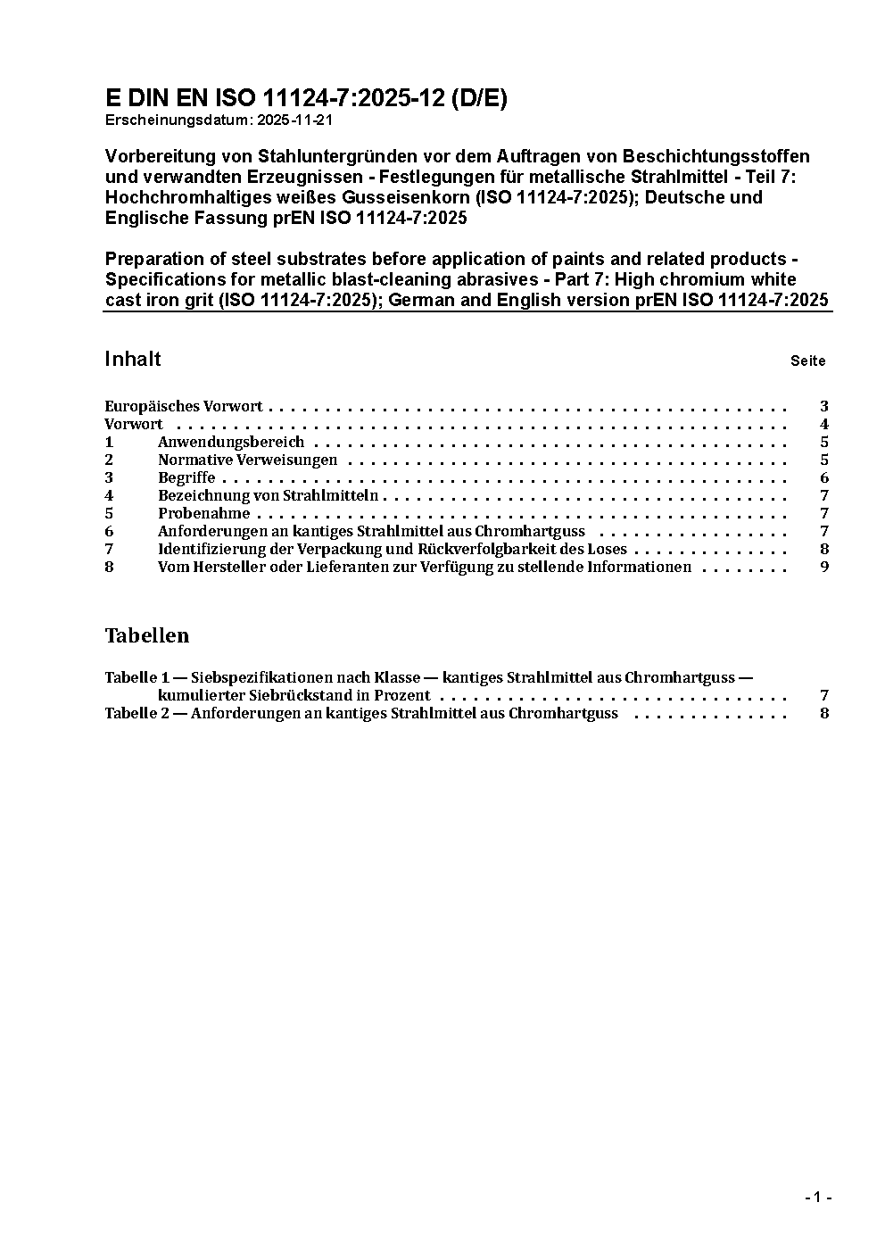 Vorbereitung von Stahluntergründen vor dem Auftragen von Beschichtungsstoffen und verwandten Erzeugnissen - Festlegungen für metallische Strahlmittel - Teil 7: Hochchromhaltiges weißes Gusseisenkorn (ISO 11124-7:2025); Deutsche und Englische Fassung prEN ISO 11124-7:2025