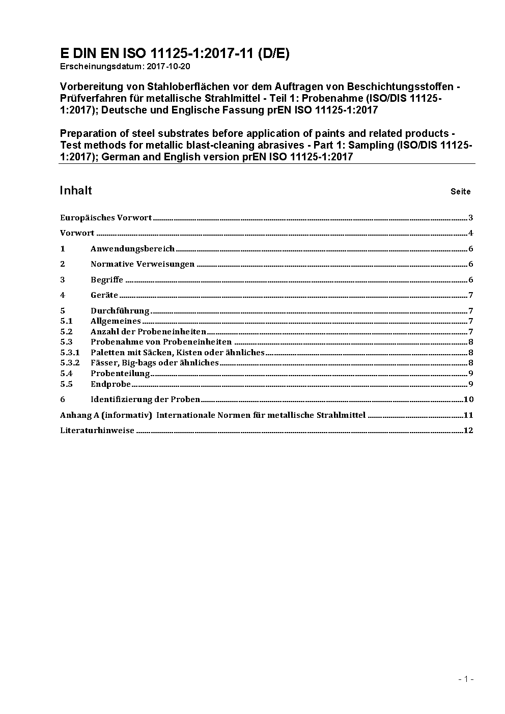 Vorbereitung von Stahloberflächen vor dem Auftragen von Beschichtungsstoffen - Prüfverfahren für metallische Strahlmittel - Teil 1: Probenahme (ISO/DIS 11125-1:2017); Deutsche und Englische Fassung prEN ISO 11125-1:2017