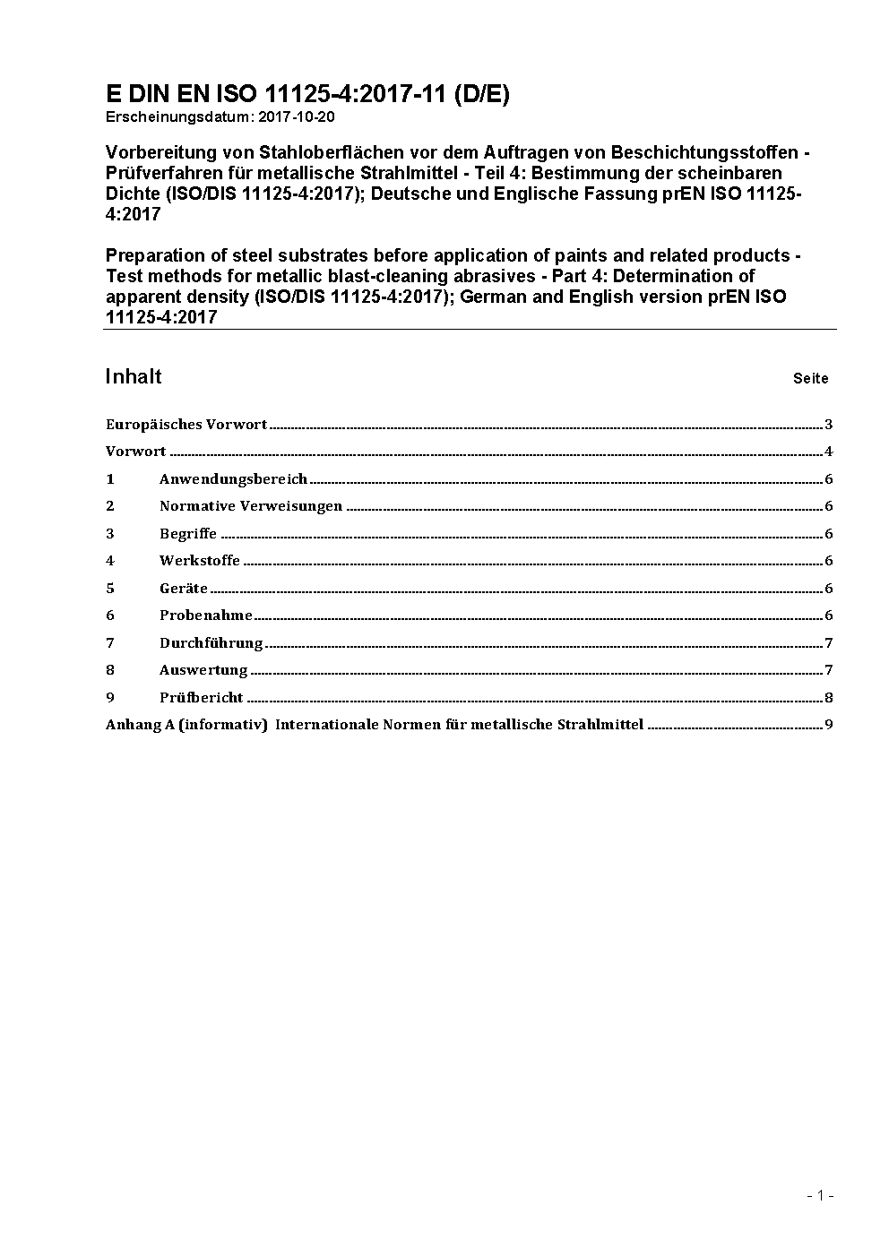 Vorbereitung von Stahloberflächen vor dem Auftragen von Beschichtungsstoffen - Prüfverfahren für metallische Strahlmittel - Teil 4: Bestimmung der scheinbaren Dichte (ISO 11125-4:1993); Deutsche Fassung EN ISO 11125-4:1997