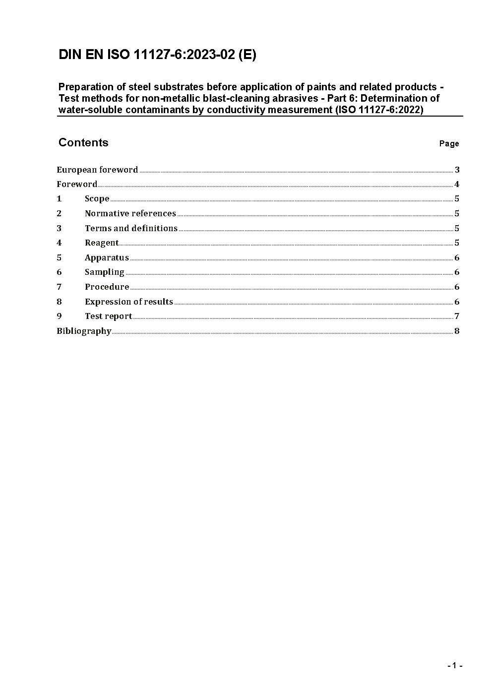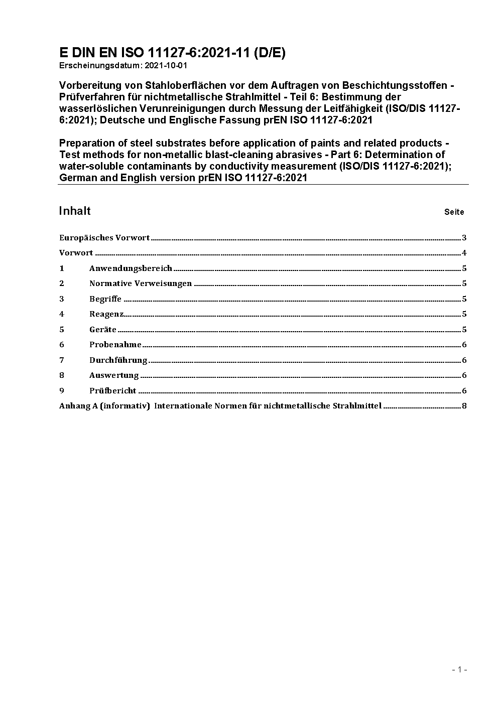 Vorbereitung von Stahloberflächen vor dem Auftragen von Beschichtungsstoffen - Prüfverfahren für nichtmetallische Strahlmittel - Teil 6: Bestimmung der wasserlöslichen Verunreinigungen durch Messung der Leitfähigkeit (ISO 11127-6:2011); Deutsche Fassung EN ISO 11127-6:2011