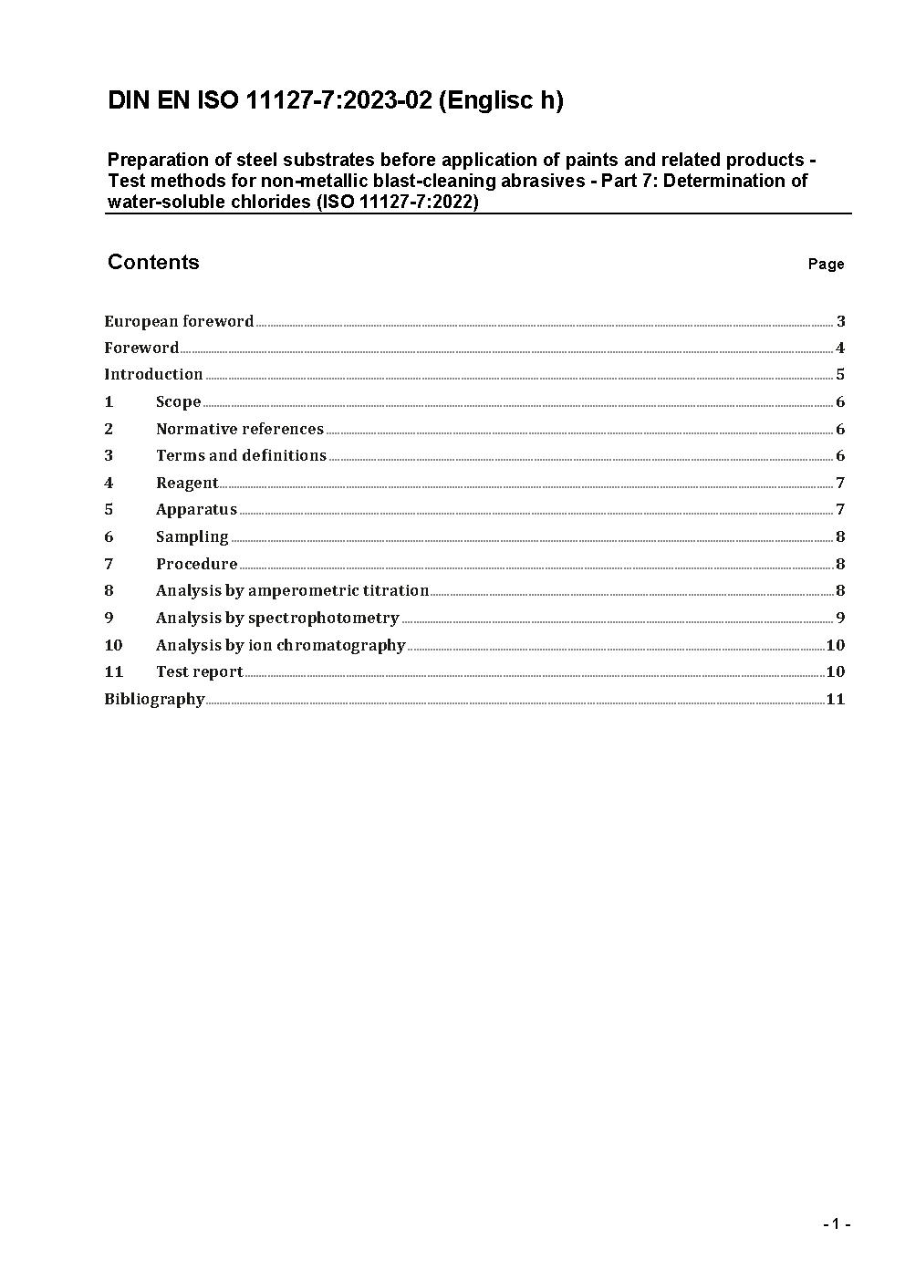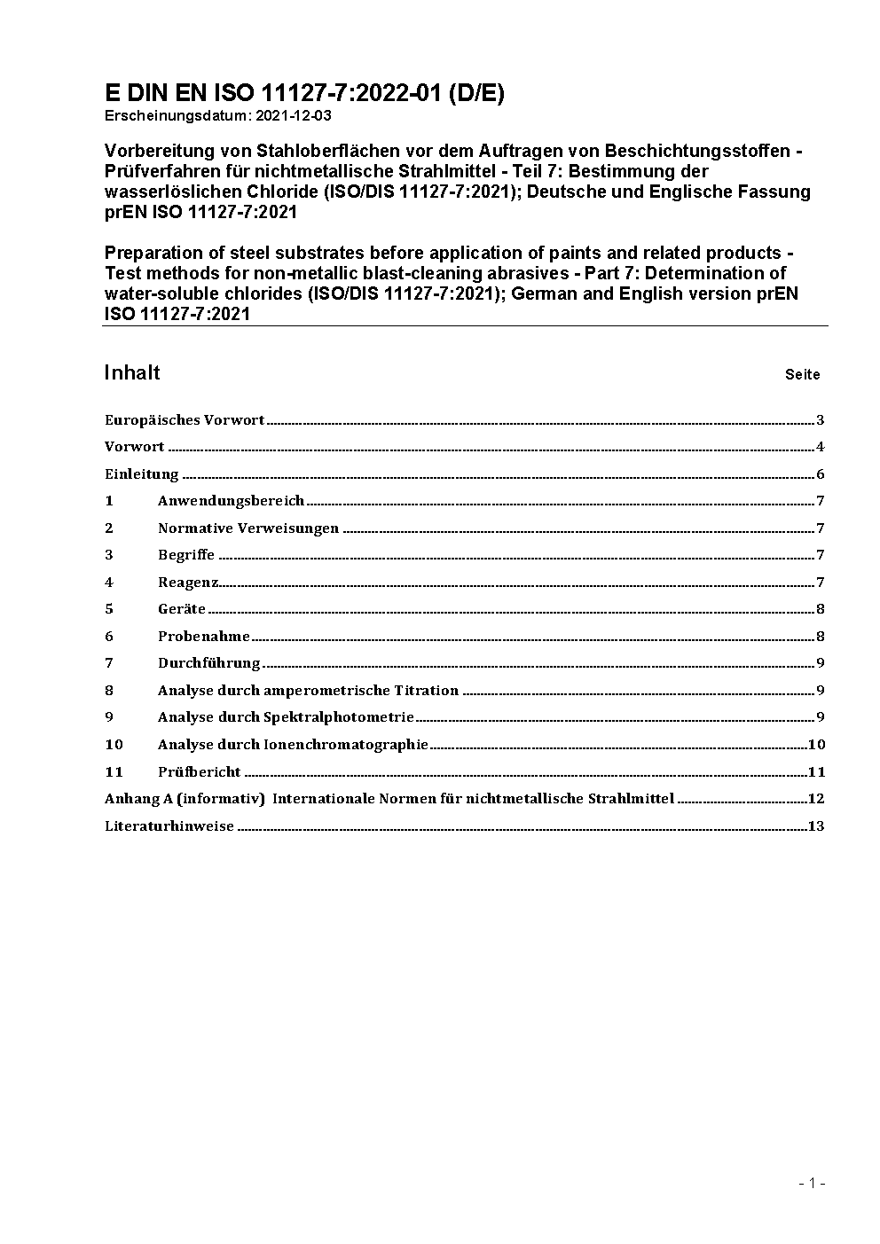 Vorbereitung von Stahloberflächen vor dem Auftragen von Beschichtungsstoffen - Prüfverfahren für nichtmetallische Strahlmittel - Teil 7: Bestimmung der wasserlöslichen Chloride (ISO 11127-7:2011); Deutsche Fassung EN ISO 11127-7:2011