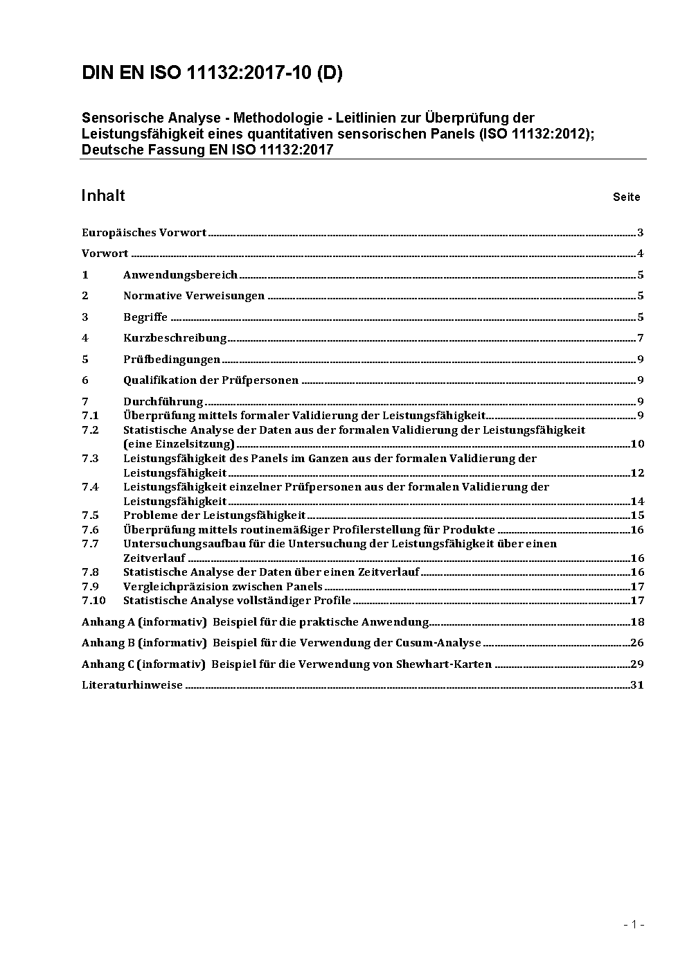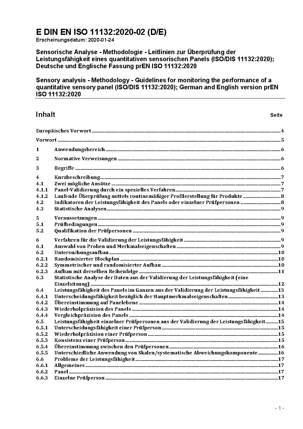 Sensorische Analyse - Methodologie - Leitlinien zur Überprüfung der Leistungsfähigkeit eines quantitativen sensorischen Panels (ISO 11132:2012); Deutsche Fassung EN ISO 11132:2017