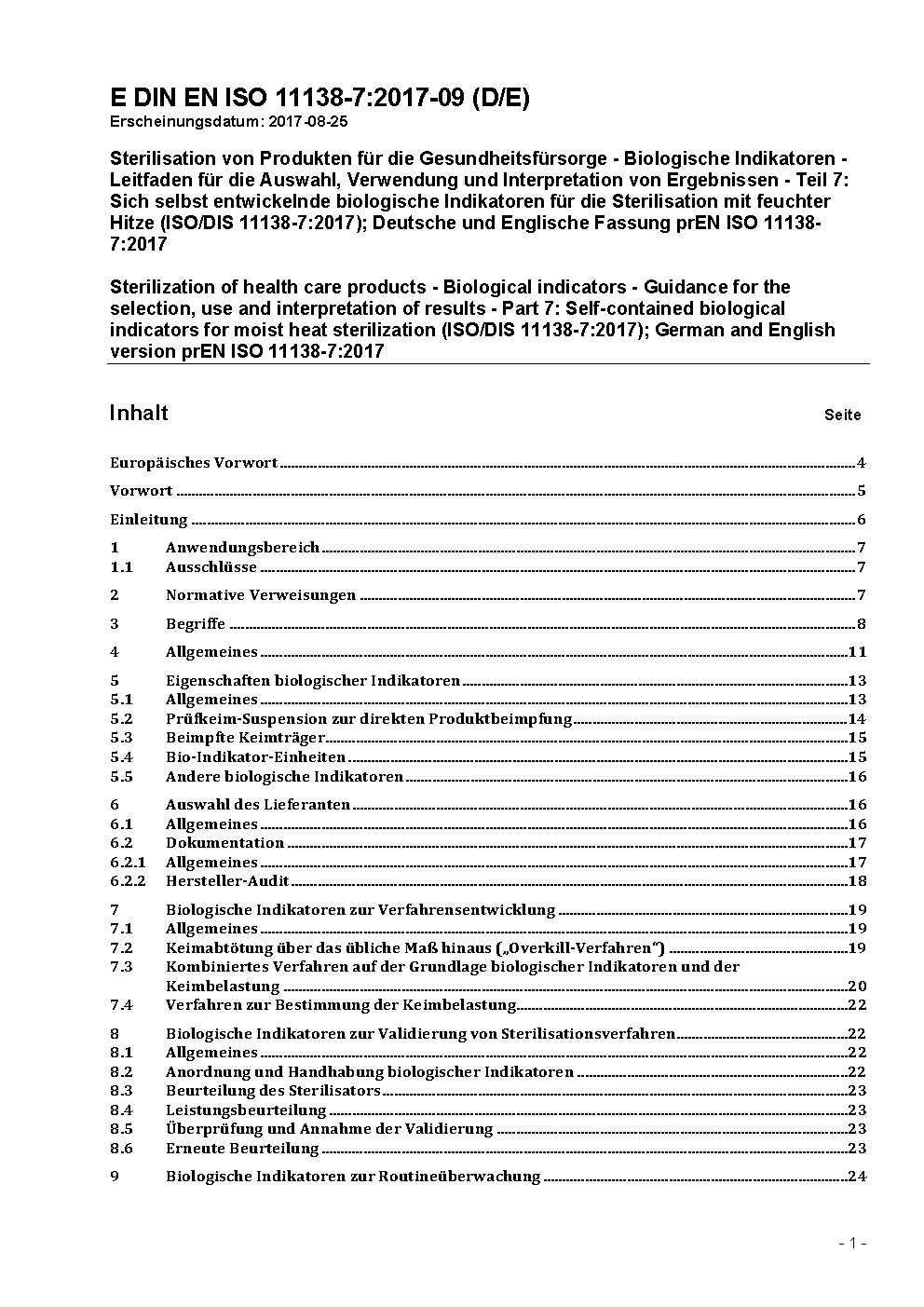 Sterilisation von Produkten für die Gesundheitsfürsorge - Biologische Indikatoren - Leitfaden für die Auswahl, Verwendung und Interpretation von Ergebnissen - Teil 7: Sich selbst entwickelnde biologische Indikatoren für die Sterilisation mit feuchter Hitze (ISO/DIS 11138-7:2017); Deutsche und Englische Fassung prEN ISO 11138-7:2017