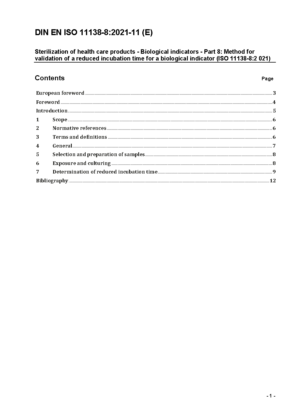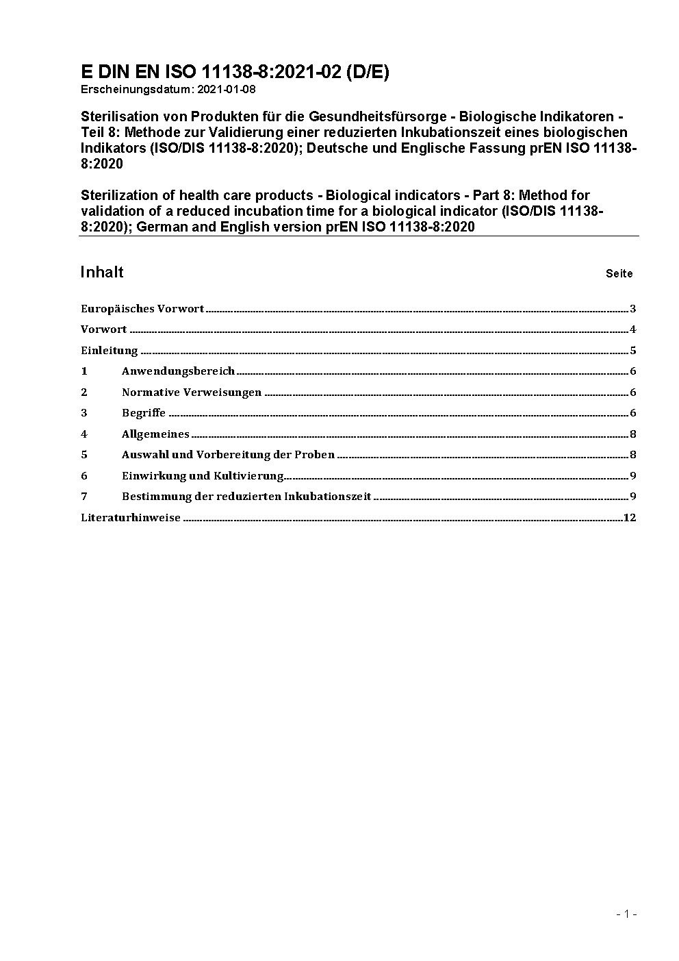 Sterilisation von Produkten für die Gesundheitsfürsorge - Biologische Indikatoren - Teil 8: Methode zur Validierung einer reduzierten Inkubationszeit eines biologischen Indikators (ISO 11138-8:2021); Deutsche Fassung EN ISO 11138-8:2021