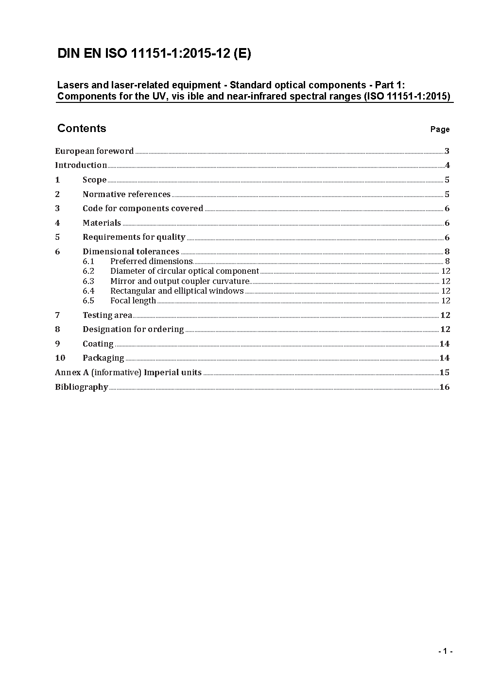 Lasers and laser-related equipment - Standard optical components - Part 1: Components for the ultraviolet, visible and near-infrared spectral range (ISO 11151-1:2000); German version EN ISO 11151-1:2000