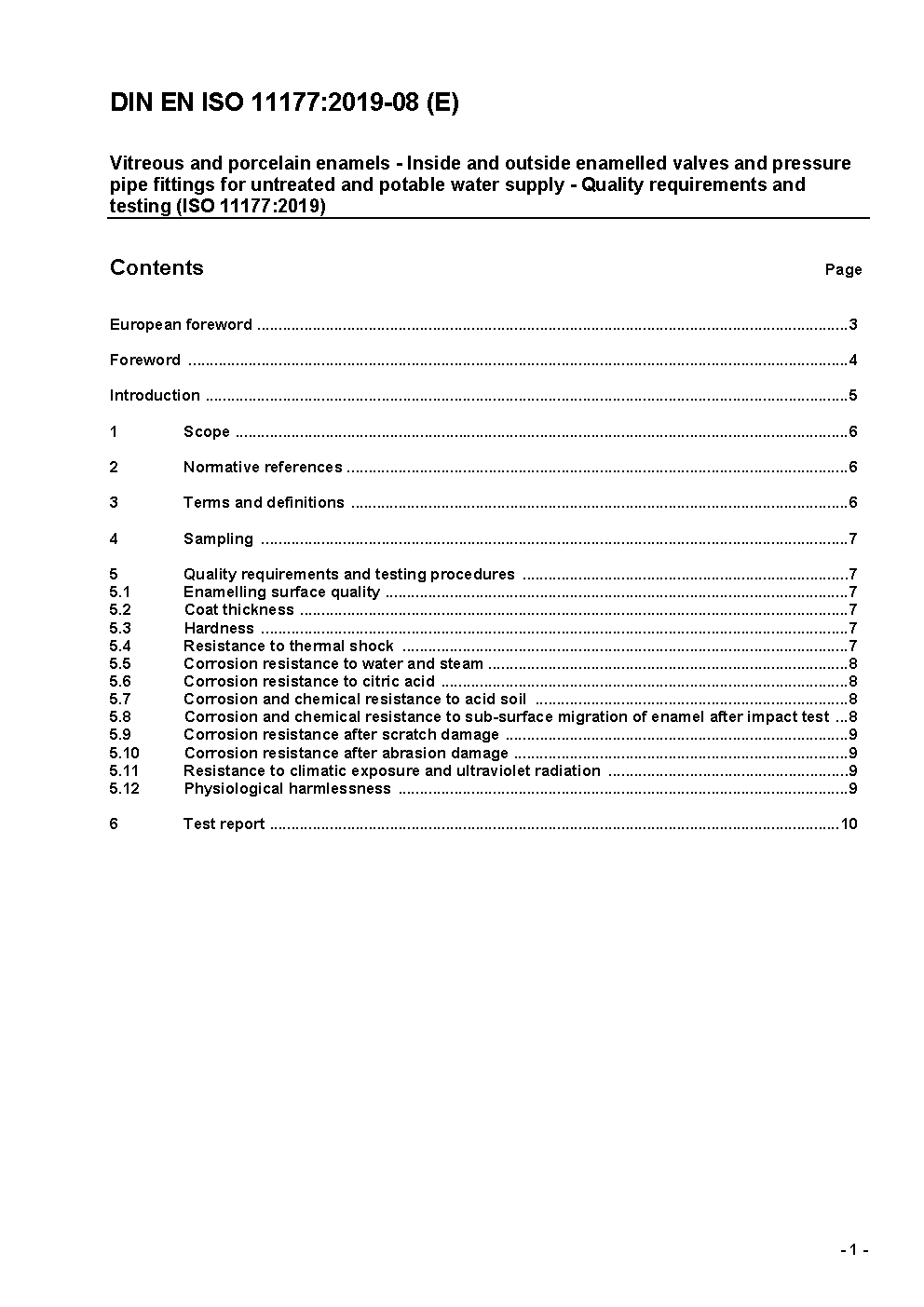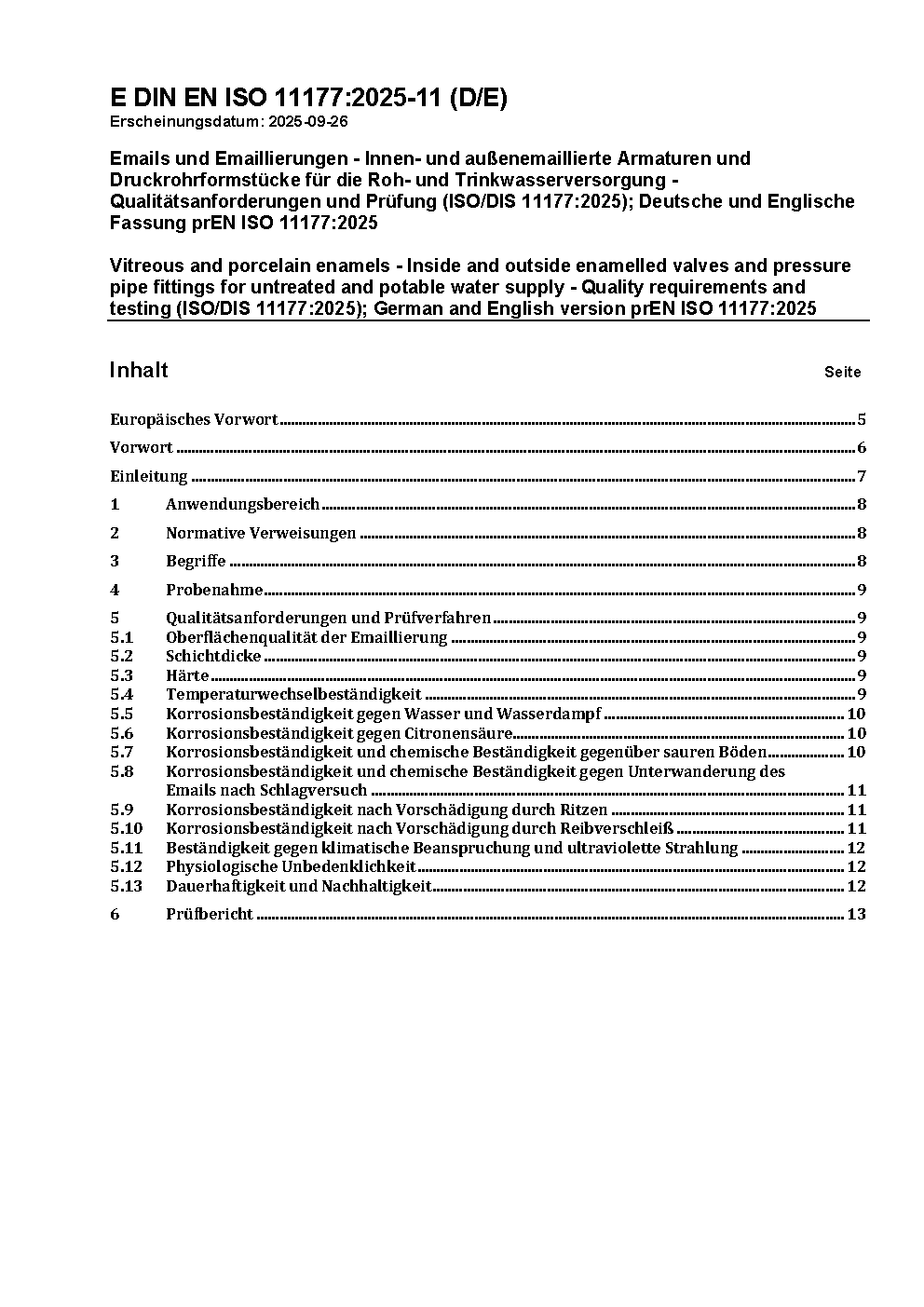 Vitreous and porcelain enamels - Inside and outside enamelled valves and pressure pipe fittings for untreated and potable water supply - Quality requirements and testing (ISO/DIS 11177:2018); German and English version prEN ISO 11177:2018