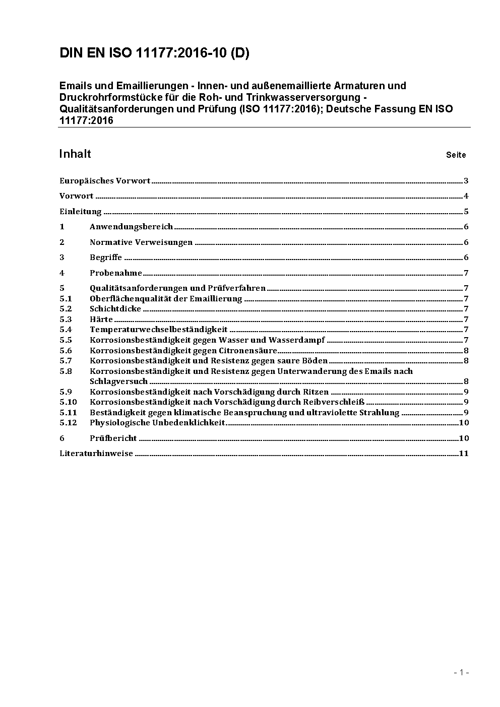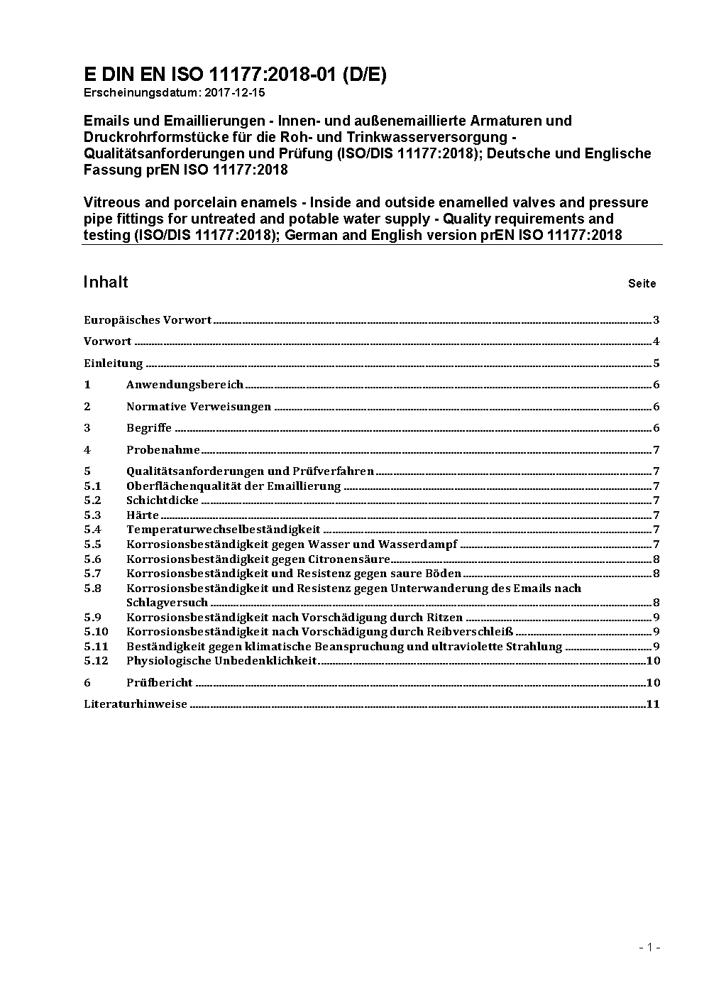 Emails und Emaillierungen - Innen- und außenemaillierte Armaturen und Druckrohrformstücke für die Roh- und Trinkwasserversorgung - Qualitätsanforderungen und Prüfung (ISO/DIS 11177:2018); Deutsche und Englische Fassung prEN ISO 11177:2018
