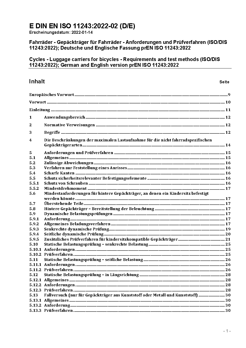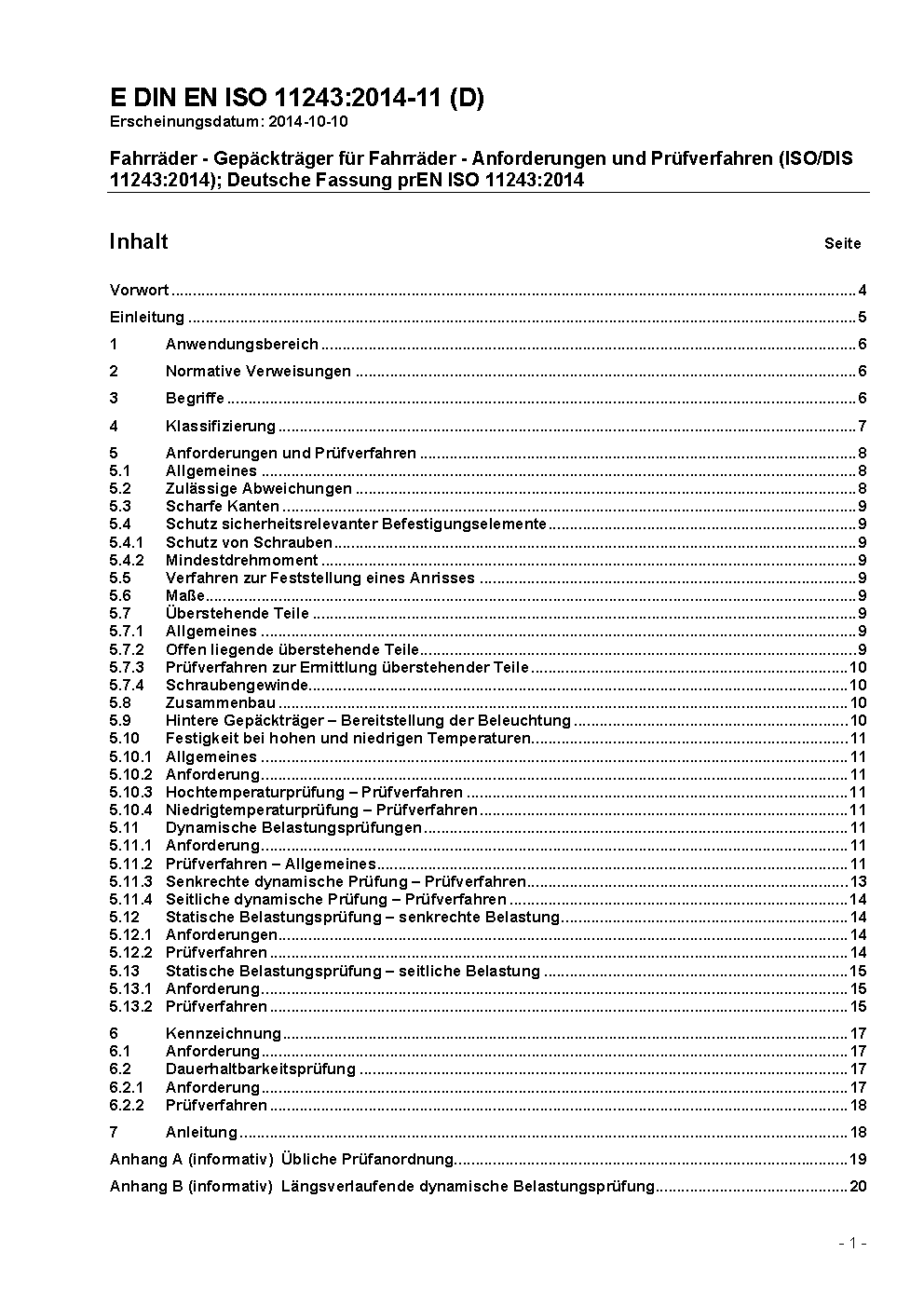 Fahrräder - Gepäckträger für Fahrräder - Anforderungen und Prüfverfahren (ISO/DIS 11243:2014); Deutsche Fassung prEN ISO 11243:2014