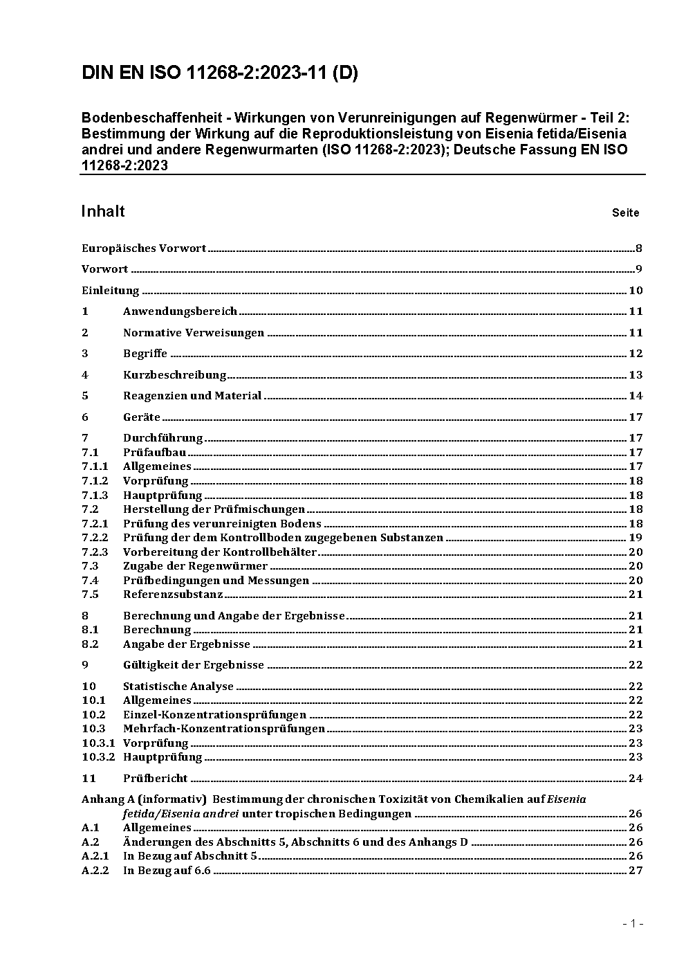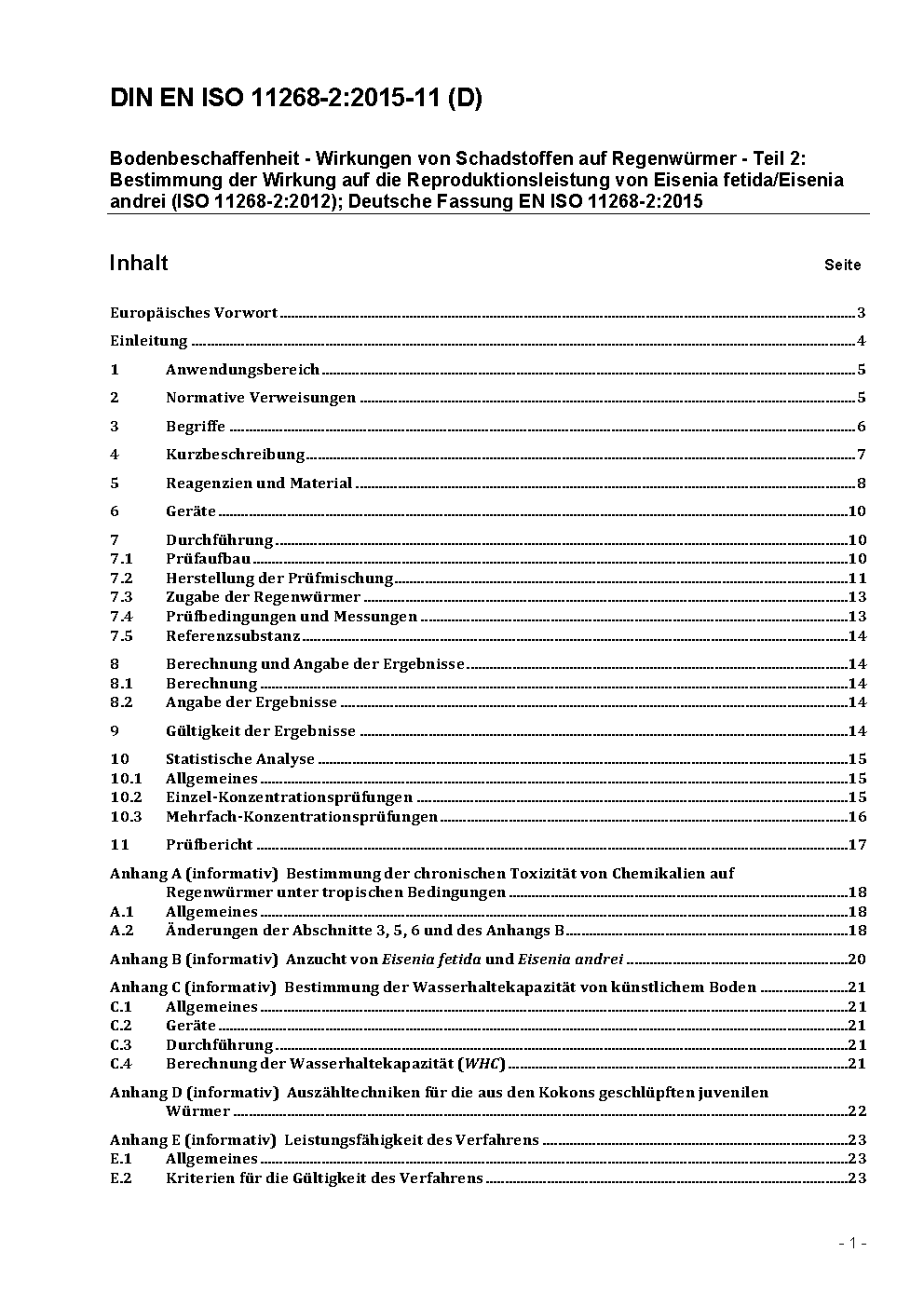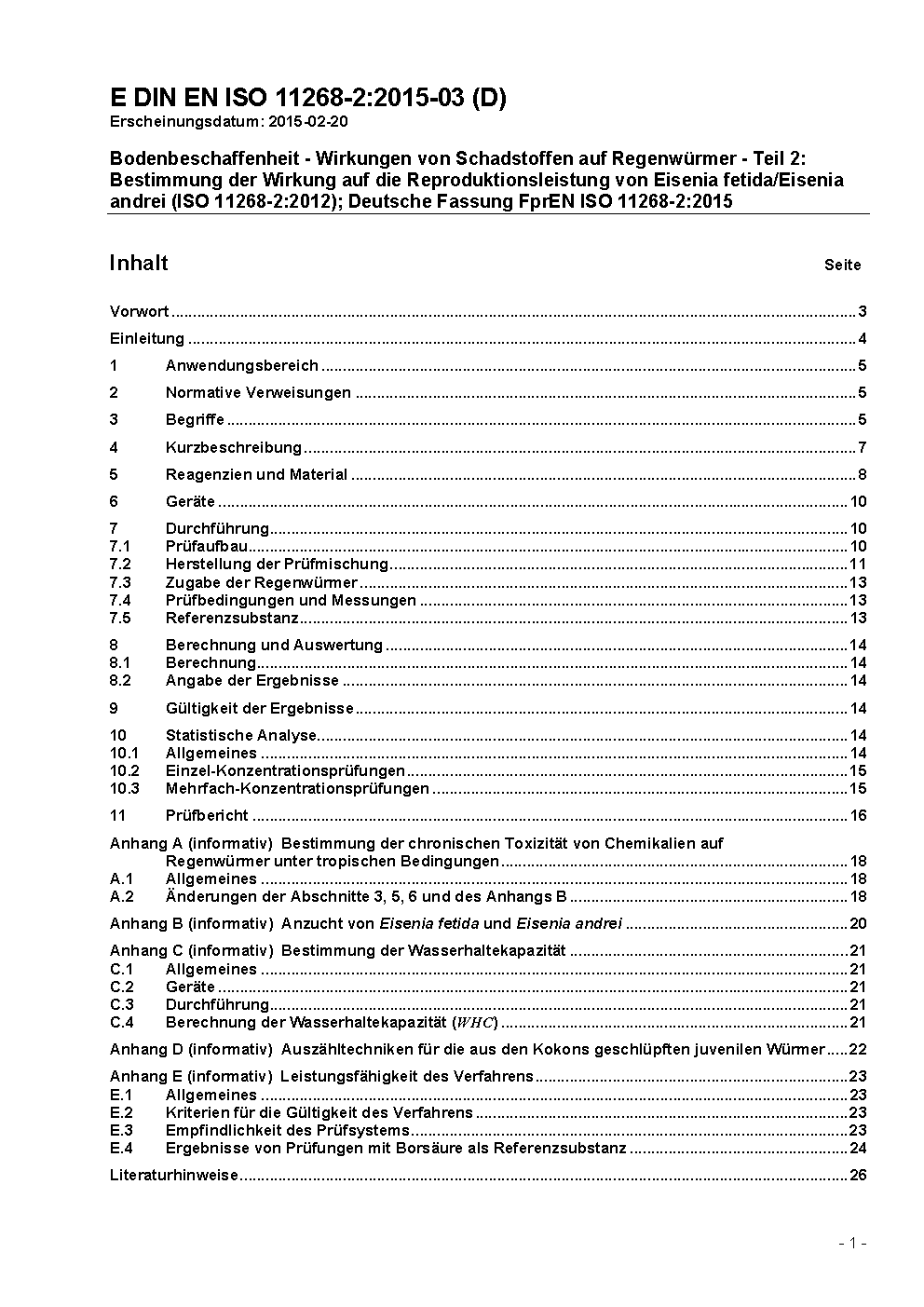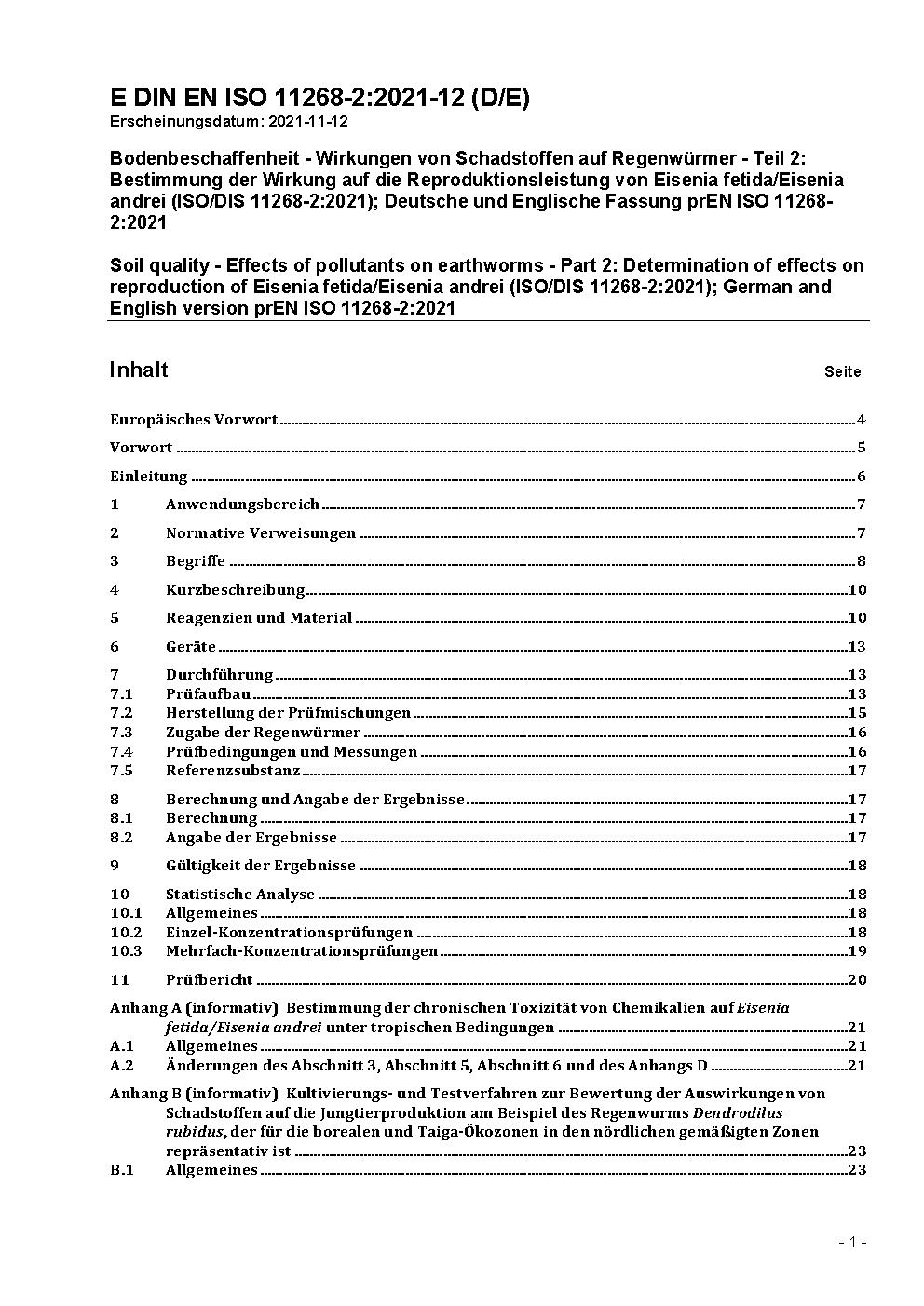 Soil quality - Effects of pollutants on earthworms - Part 2: Determination of effects on reproduction of Eisenia fetida/Eisenia andrei (ISO/DIS 11268-2:2021); German and English version prEN ISO 11268-2:2021